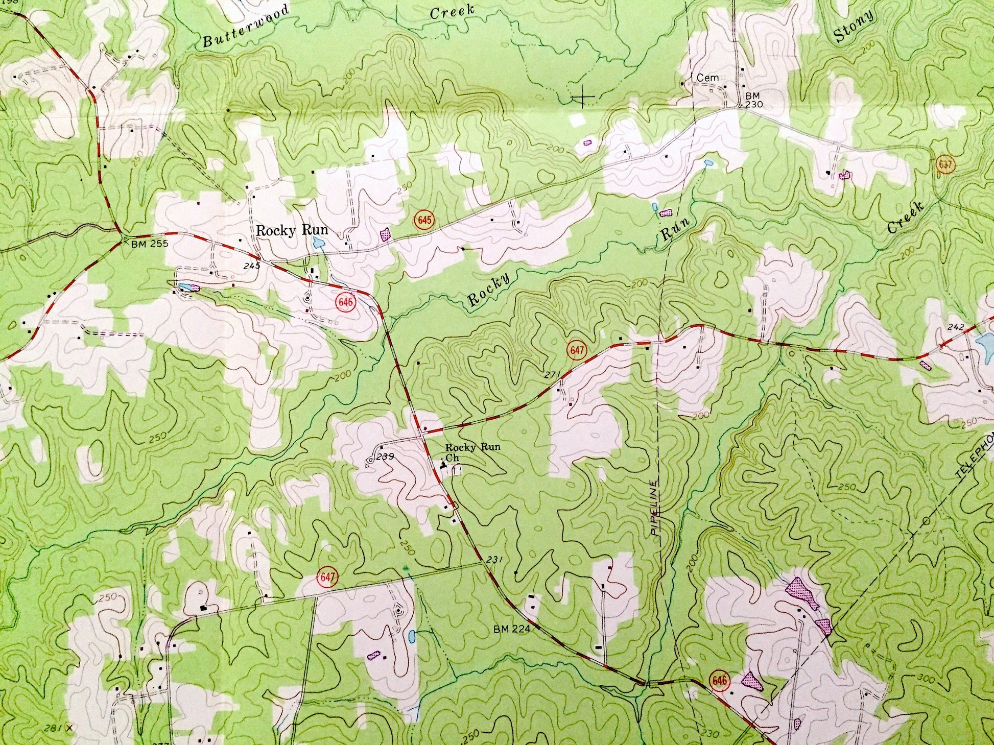 Points of Interest: Dinwidde County, Colemans Lake, White Oak Creek, Wheelers Pond, Butterwood Creek, Rocky Run Creek, Stony Creek, Sappony Creek, Snap Lodge Branch, Seaboard Coast Railroad Line, Seat Island Branch, , and many more creeks, hills, houses and roads.