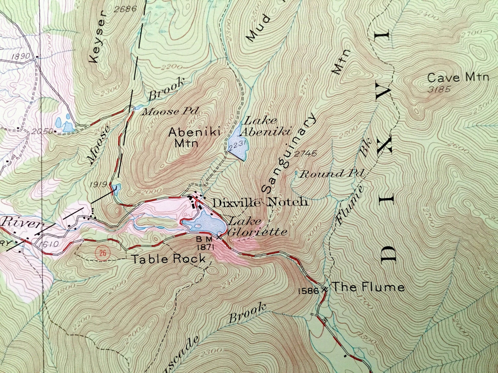 Points of Interest: Dixville Notch, Mohawk River, Lake Gloriette, Lake Abeniki, Diamond Pond, Little Diamond Pond, Millsfield Pond, Phillips Pond, Nash Bog Pond, Mud Pond, Bishop Brook, Diamond River, Alder Brook, Blueberry Swamp, Simms Stream, Clear Stream, The Flume, Stewartstown Hollow, Dead Water Ridge, Piper Hill, Collins Hill, Hedgehog Hill, Dearth Hill, Mudget Mountain, Holden Hill, Diamond Ridge, South Ridge, Black Bluff Hill, Blue Ridge, Tumble Dick Mountain, Nathan Pond Ridge, Carlton Hill, State Fish Hatchery, Abeniki Mountain, Table Rock, Cave Mountain, Mud Pond Ridge, Sugar Hill, Van Dyck Mountain, Cleveland Notch, Blue Mountain, Gore Notch, Cranberry Bog Notch, Moran Natch, Gadwah Notch, Devils Washbowl, Kingston Dam, Mt. Kelsey, Owlhead Mountain, Mt. Metalak, Maine Central Railroad and lots more hills, mountains, streams, ponds, marshes, camps, roads.