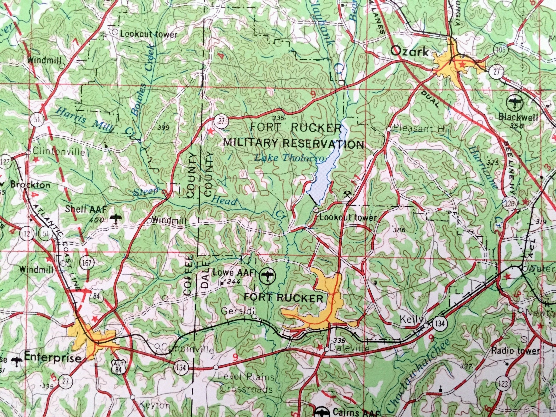 Points of Interest: ALABAMA - Walter George Reservoir, Chattahoochee River, Chattahoochee State Park, Conecuh River, Fort Rucker Military Reservation and lots more hills, mountains, lakes, rivers, creeks, roads, highways and railroads.