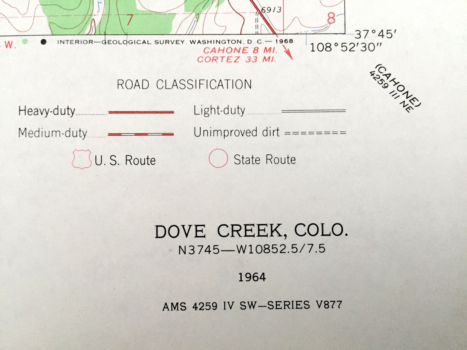 Beautiful, antique map of Dove Creek, Colorado, and surrounding Dolores County area. This is an authentic 1964 print from the U.S. Geological Survey and NOT a computer reprint.