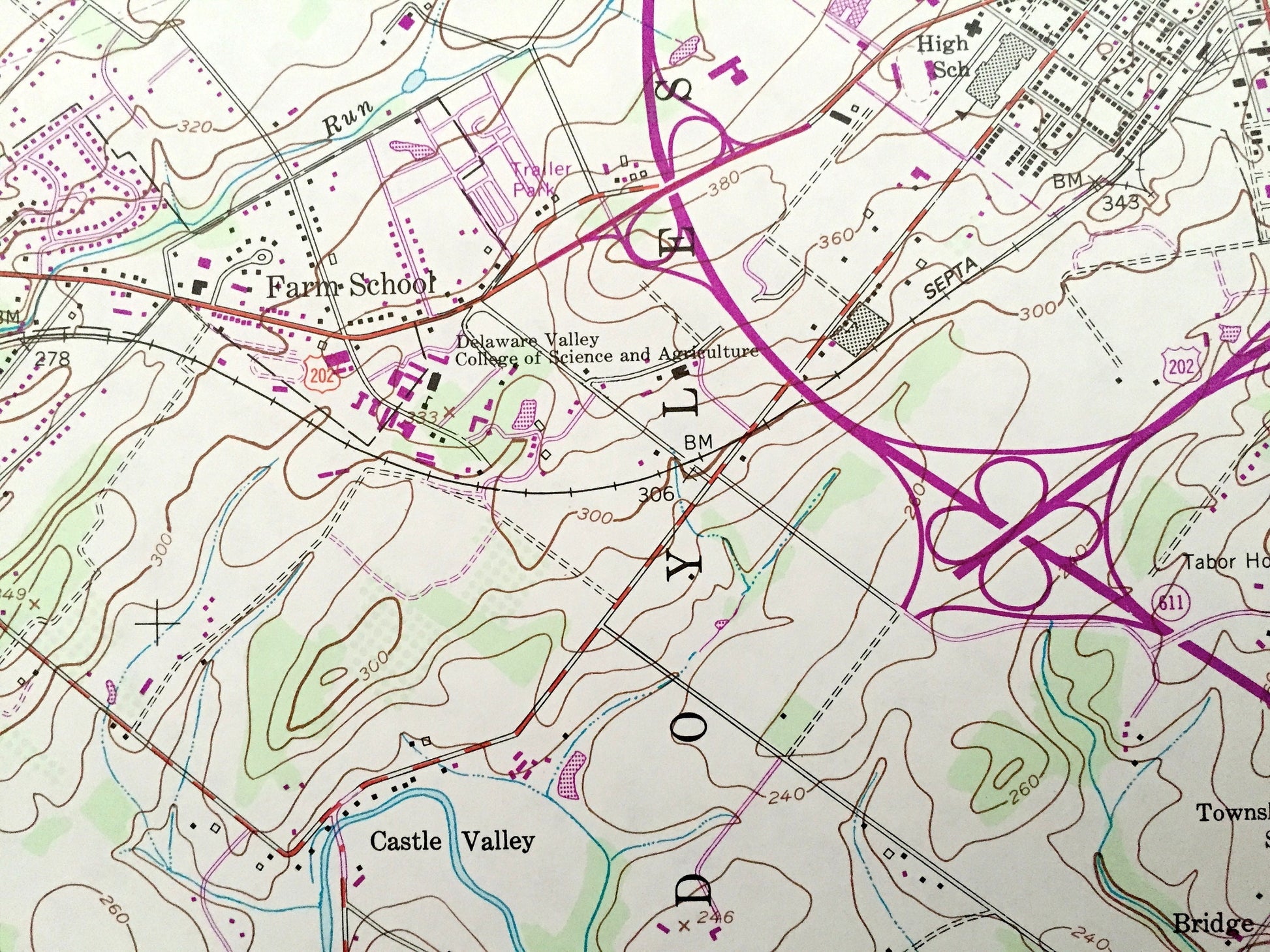 Points of Interest: Peace Valley Park, Warrington Airfield, Delaware Valley College of Science and Agriculture, forest Park, Doylestown Airport, Neshaminy Creek, Mill Creek, Morris Run, Pine Run, North Branch, Deep Run, and many more hills, streams, ponds, houses, schools, railroads, churches and roads.