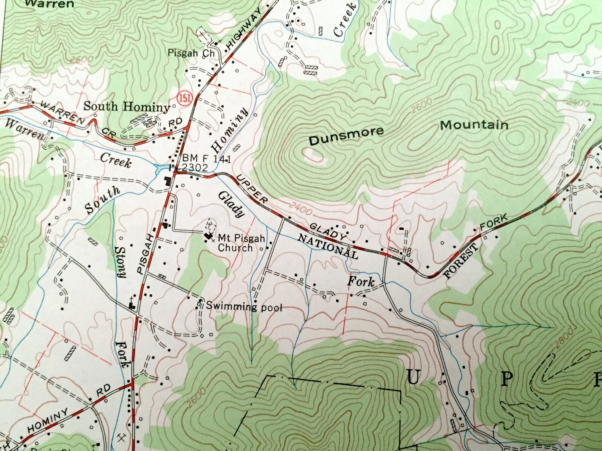 Points of Interest: Transylvania County, Henderson County, Buncombe County, Pisgah National Forest, Beaverdam Wildlife Restoration Area, Bent Creek Experimental Forest, Laurel Mountain, Long Mountain, Saw Mountain, Dunsmore Mountain, BUzzard Knob, Trace Ridge and lots more hills, mountains, streams, ponds, lakes, rivers, schools, churches, houses, and roads.