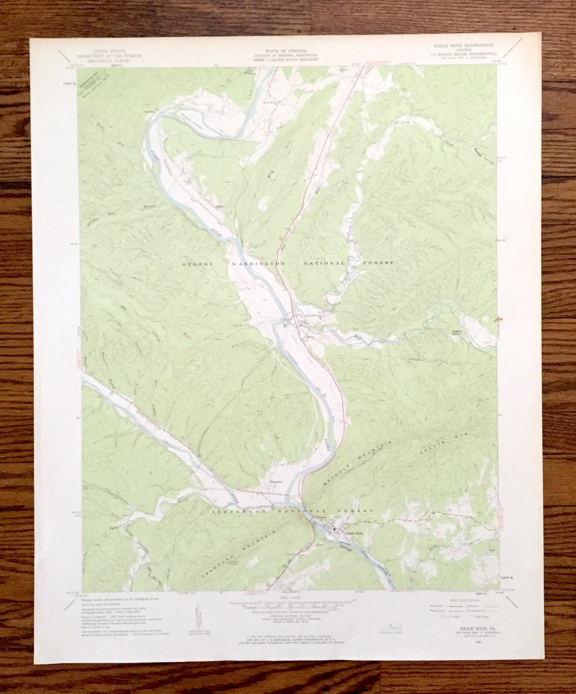 Beautiful, antique map of Eagle Rock, Virginia and surrounding Botetourt County area. This is an authentic 1962 edition, 1963 print from the U.S. Geological Survey and NOT a computer reproduction.