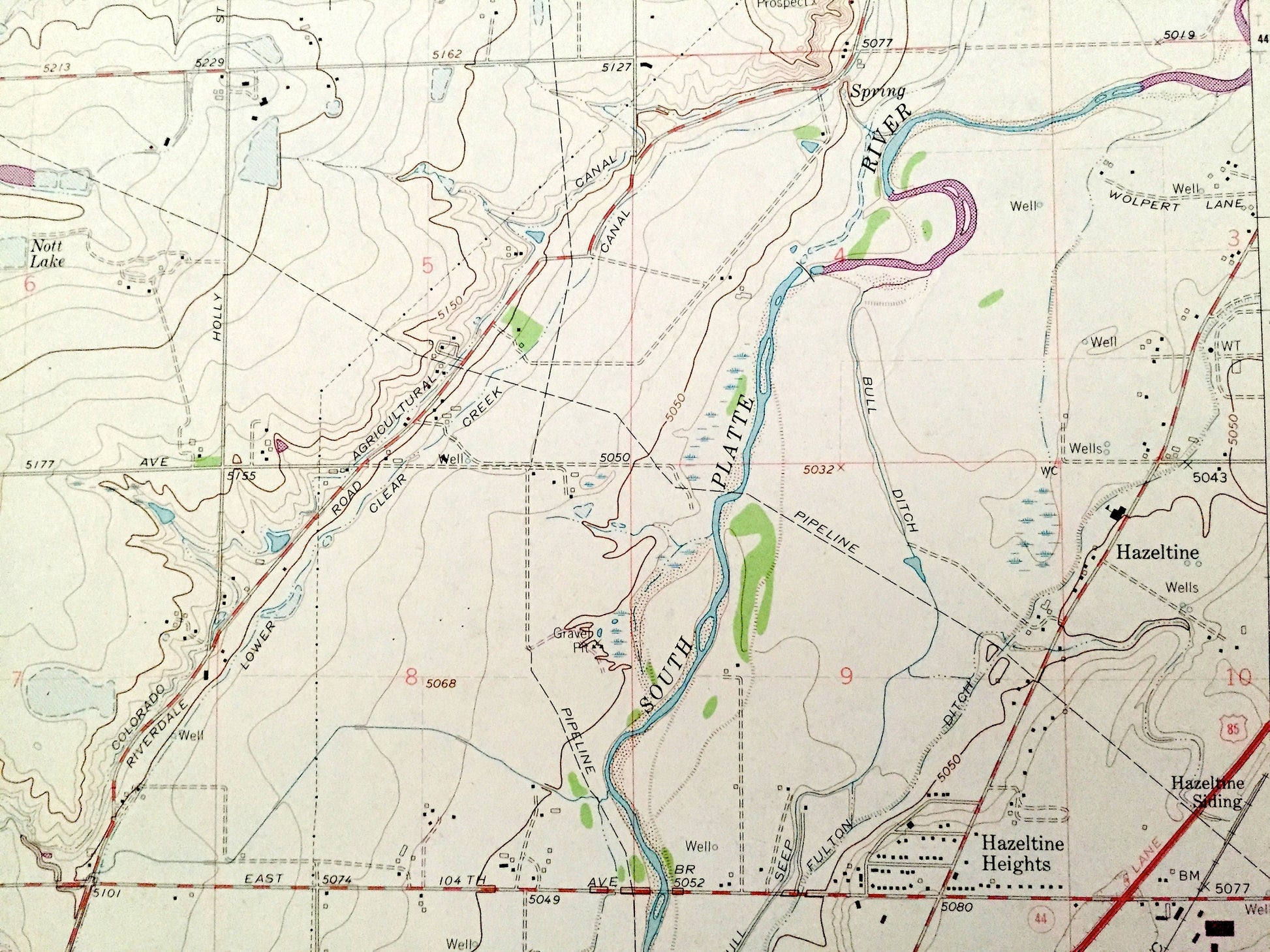 Points of Interest: Adams County, South Platte River, Lake Erie, Poitz Reservoir, Eastlake Reservoir, Smith Reservoir, Grange Hall, Colorado Agricultural Canal, Grange Hall Stream, Big Dry Creek, and many more smaller ponds, streams, houses, schools, roads, churches and train tracks.