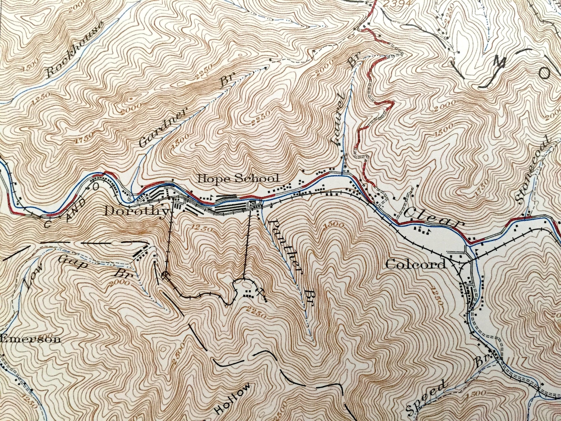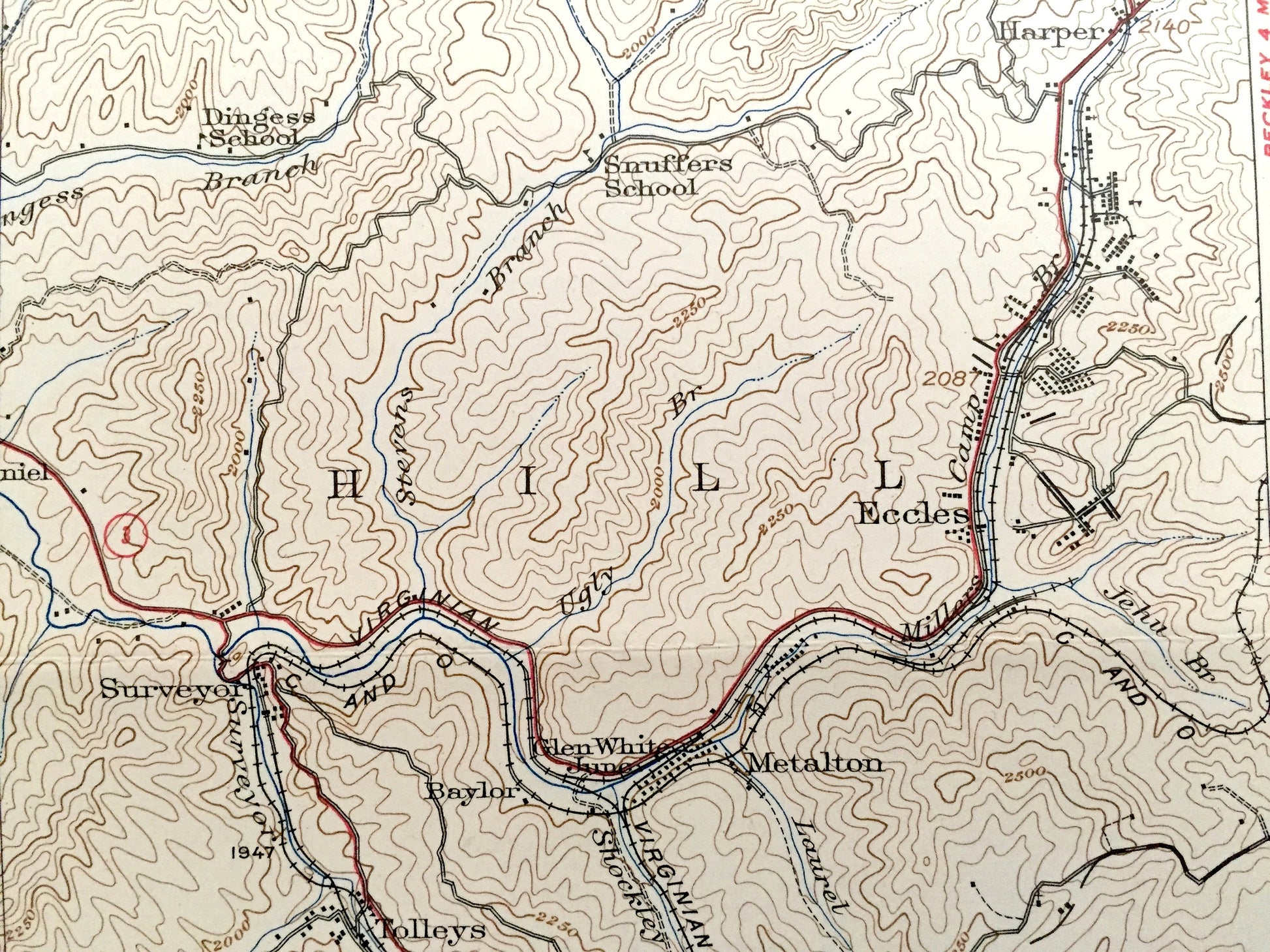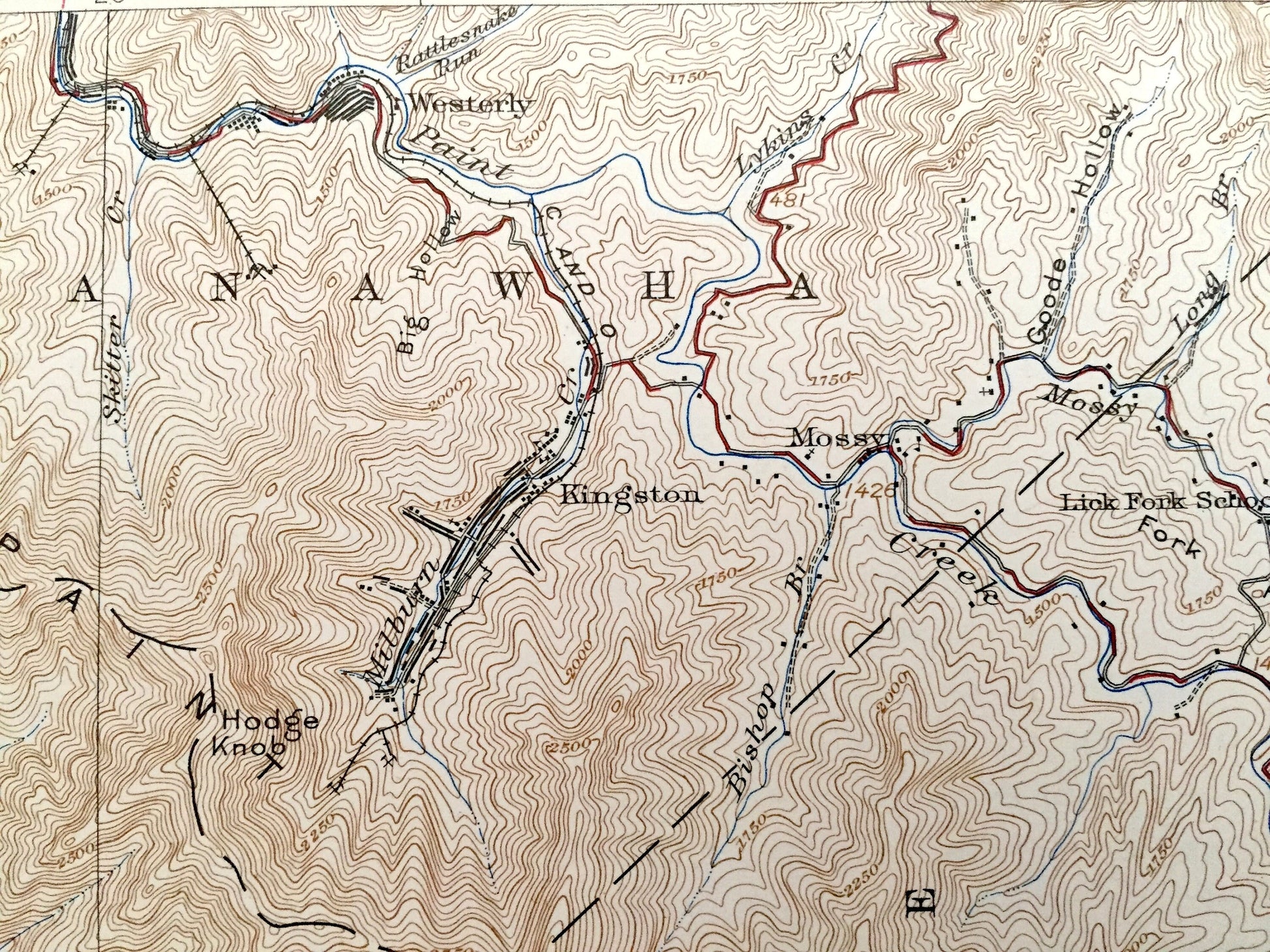 Points of Interest: Paint Creek, Clear Creek, Guyandot Mountain, Kayford Mountain, Chesapeake & Ohio Railway, Peachtree Ridge, Virginian Railway, Coal River Mountain, Chestnut Flat Mountain, and lots more hills, mountains, creeks, towns, roads and train tracks.