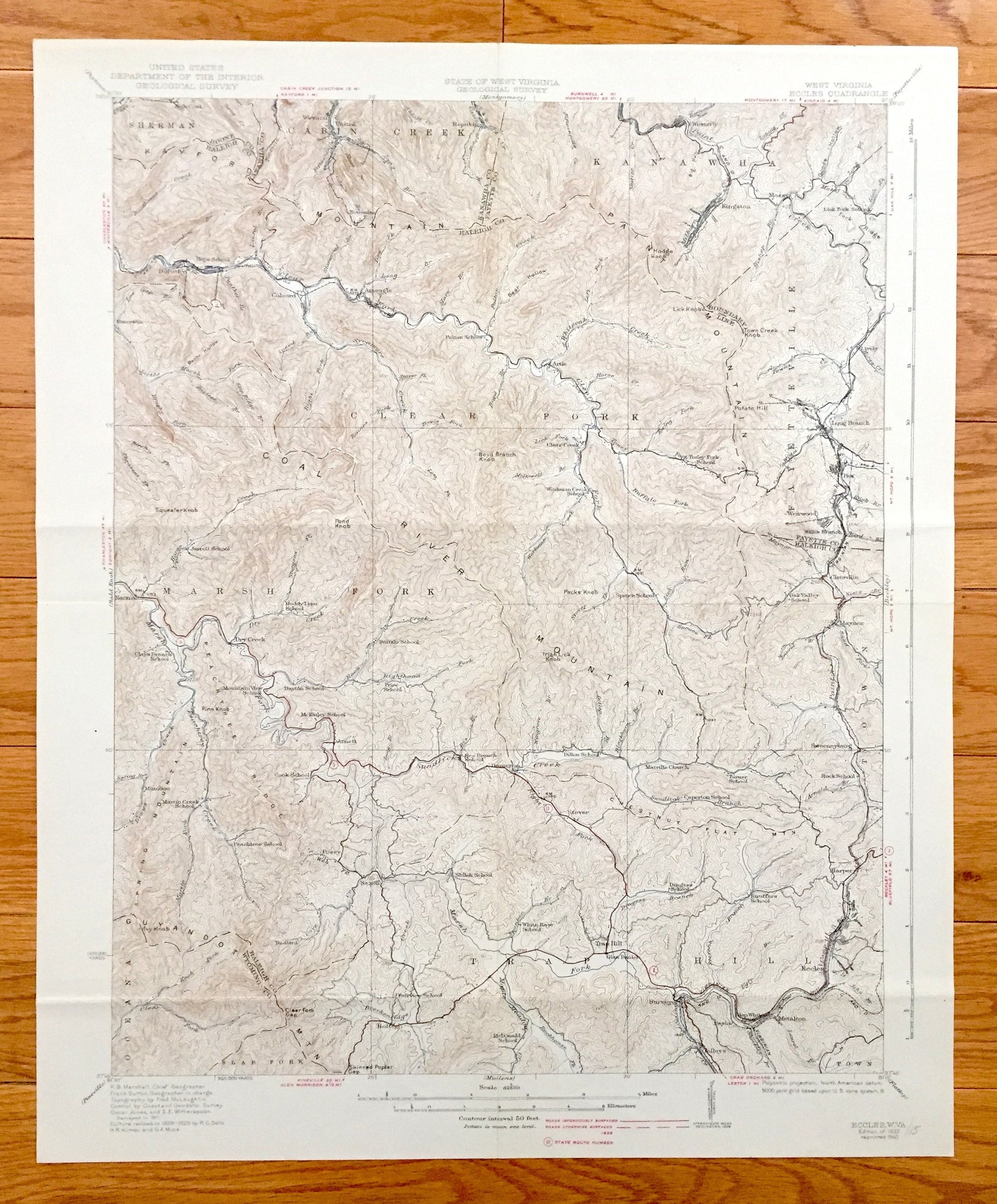 Beautiful, antique map of Eccles, West Virginia and surrounding Raleigh, Wyoming, Boone, Kanawha, and Fayette County area. This is an authentic 1932 edition, 1940 print from the U.S. Geological Survey and NOT a computer reproduction.