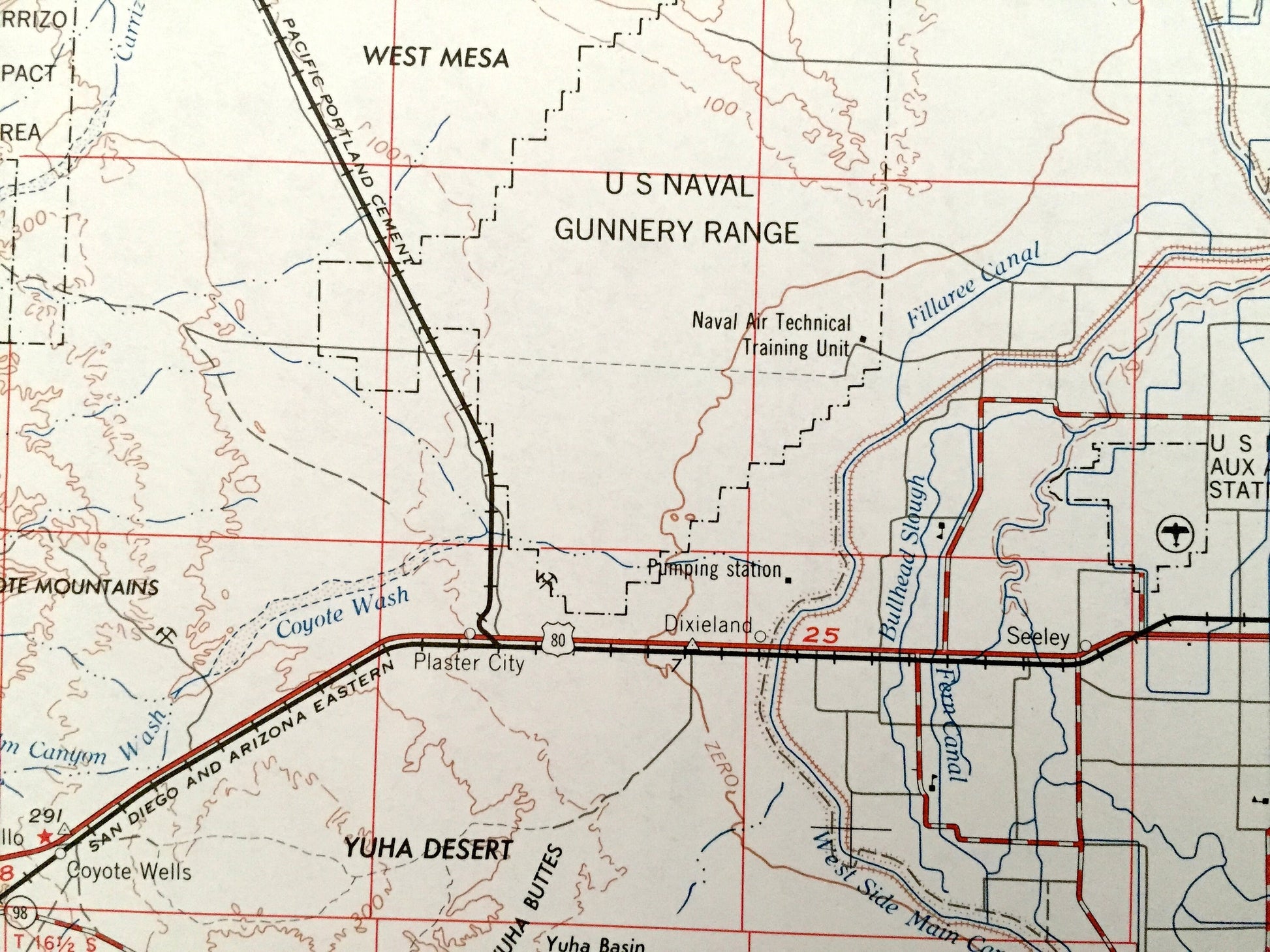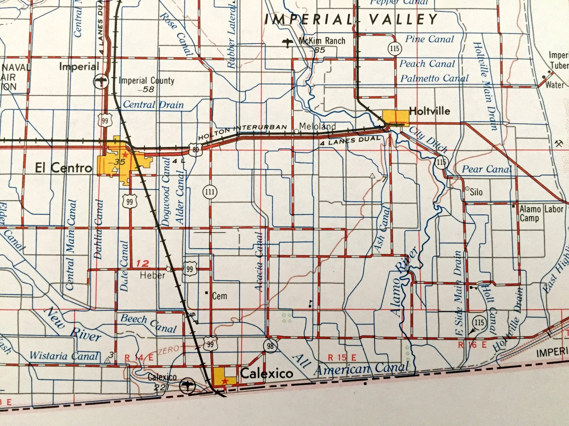 Points of Interest: CALIFORNIA - Mexico, Imperial Valley, Yuha Desert, East Mesa, Sand Hills, Sand Dunes, Superstition Mountain, Coyote Mountains, Chocolate Mountains, Signal Mt. Parachute Drop Area, New River, Alamo River, All American Canal, Coachella Canal, Colorado River, Imperial National Wildlife Refuge and lots more hills, mountains, rivers, lakes, creeks, roads, highways and railroads.