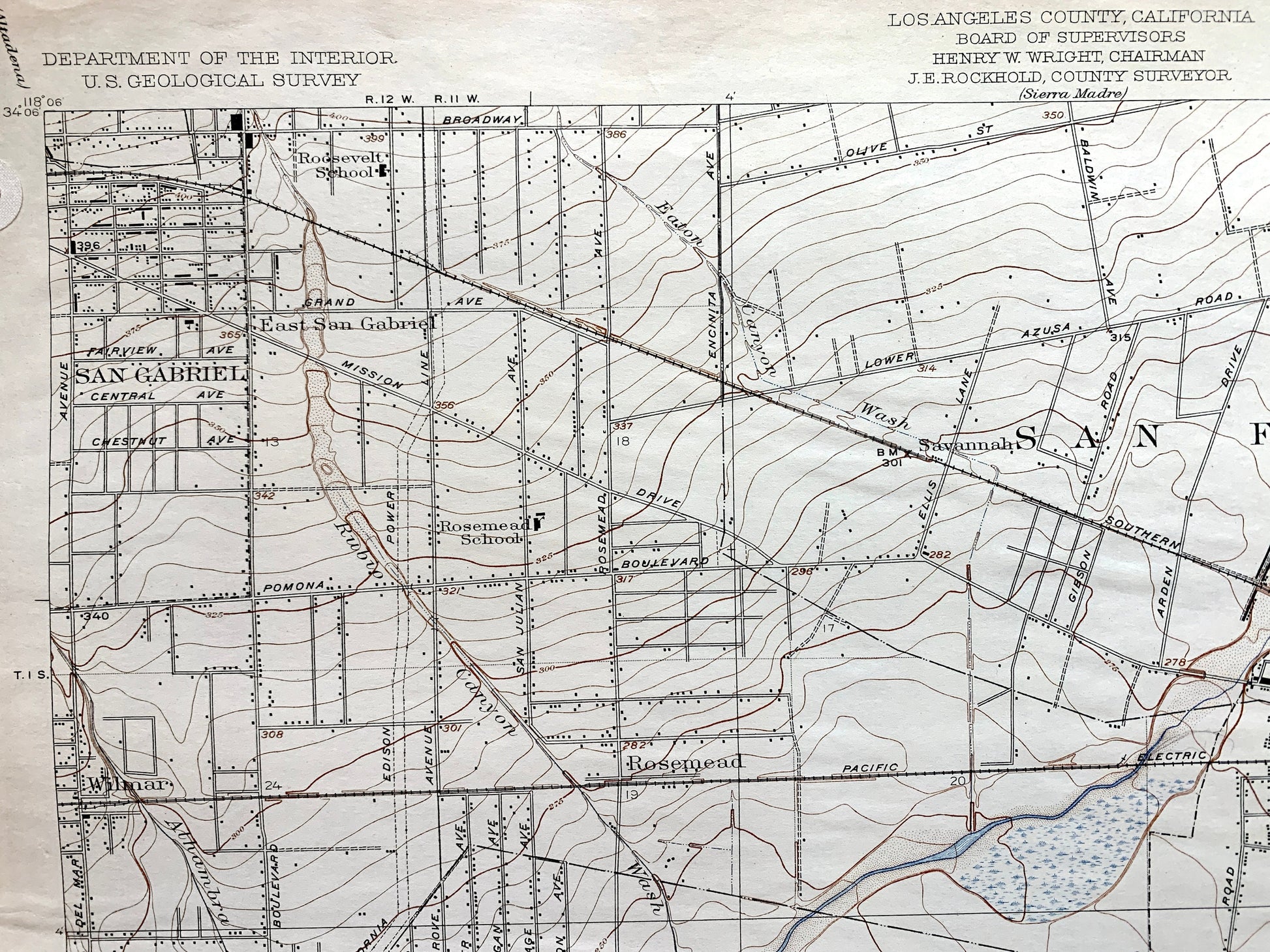Points of Interest: Los Angeles County, San Gabriel River, Rio Hondo, Montebello Hills, Legg Lake, Whittier Narrows Dam, Alhambra Wash, Puente Hills, Lacy Park, Sycamore Canyon, Rose Hills Memorial Park, and many more hills, streams, ponds, houses, schools, churches and roads.