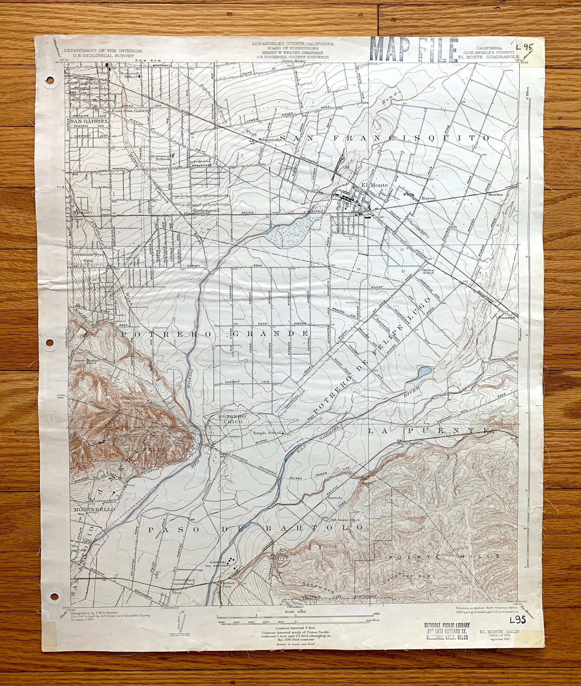 Beautiful, antique map of El Monte, California and surrounding Los Angeles County area. This is an authentic 1926 edition, 1932 print from the U.S. Geological Survey and NOT a computer reproduction. It is from a Geologic Atlas folio.