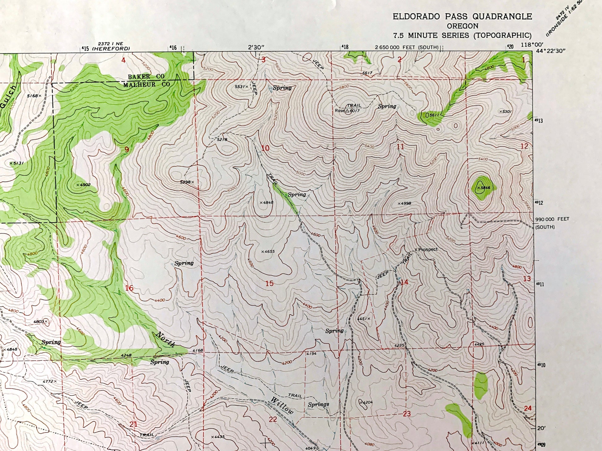 Beautiful, antique map of Eldorado Pass, Oregon and surrounding Baker County and Malheur County areas. This is an authentic 1972 edition, 1976 print from the U.S. Geological Survey and NOT a computer reproduction.