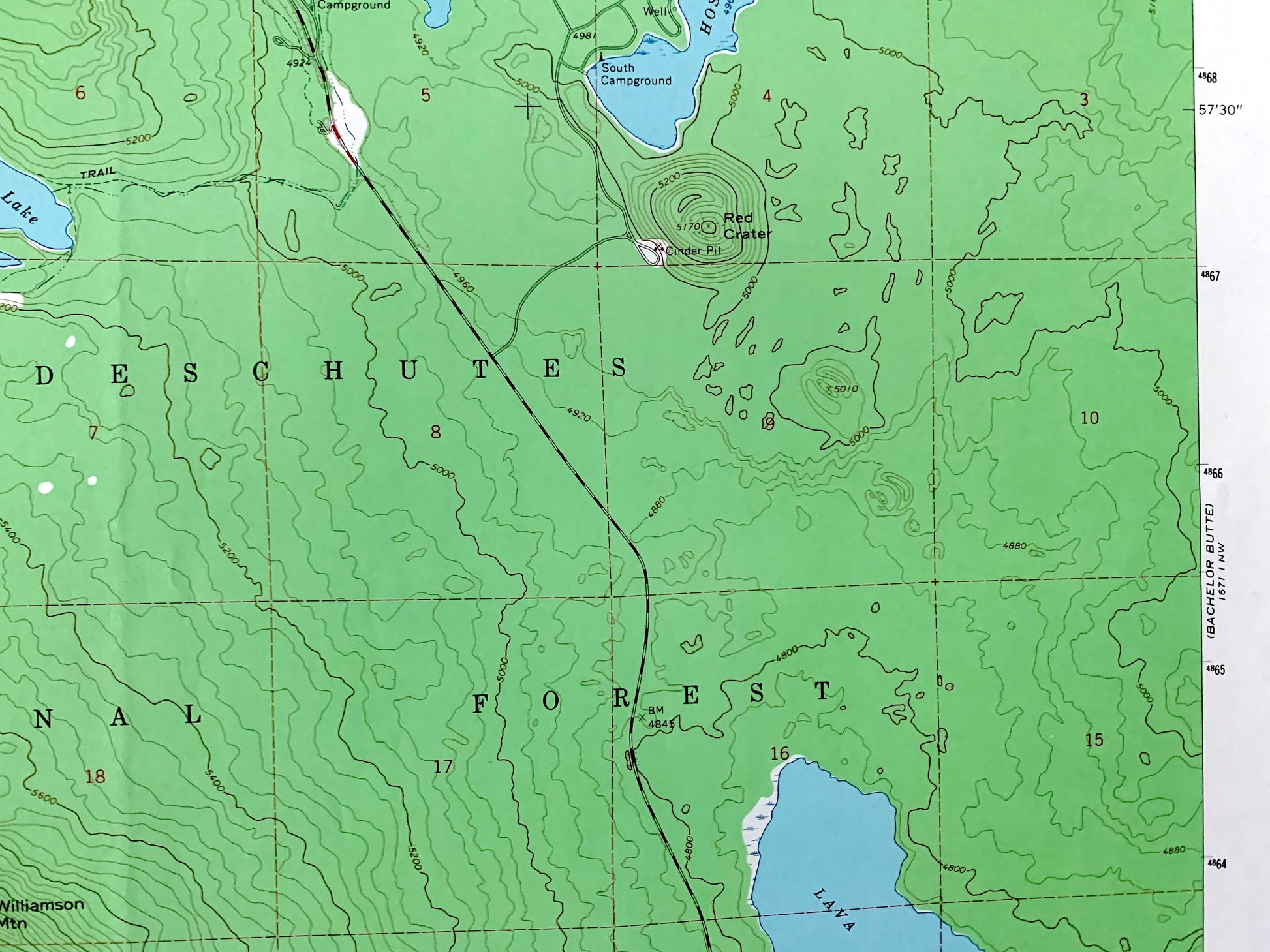 Points of Interest: Deschutes National Forest, Willamette National Forest, Hosmer Lake, Blow Lake, Doris Lake, Senoj Lake, Leech Lake, Lava Lake, Lucky Lake, Island Meadow, Elk Mountain, Moolack Butte, Williamson Mountain, Lucky Butte, Hosmer Lake Trail, Deschutes River, Quinn Creek, Quinn Meadows, and many more hills, streams, ponds, houses, schools, railroads, churches and roads.