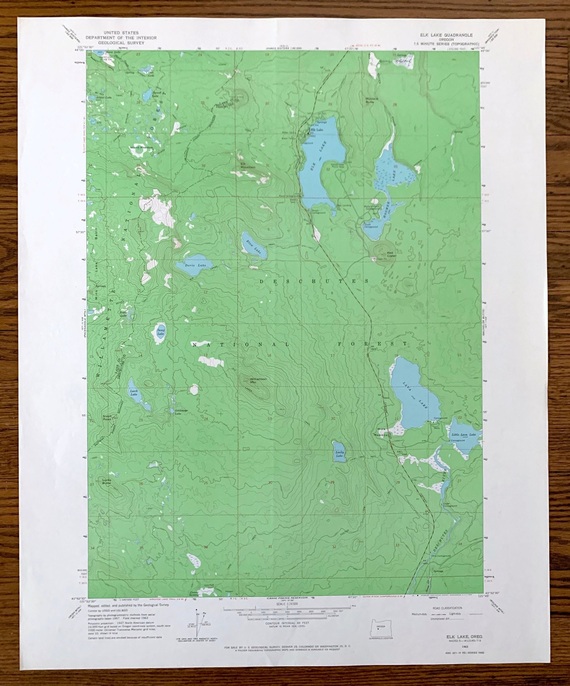 Beautiful, antique map of Elk Lake, Oregon and surrounding Lane County and Deschutes County areas. This is an authentic 1963 edition, 1965 print from the U.S. Geological Survey and NOT a computer reproduction.