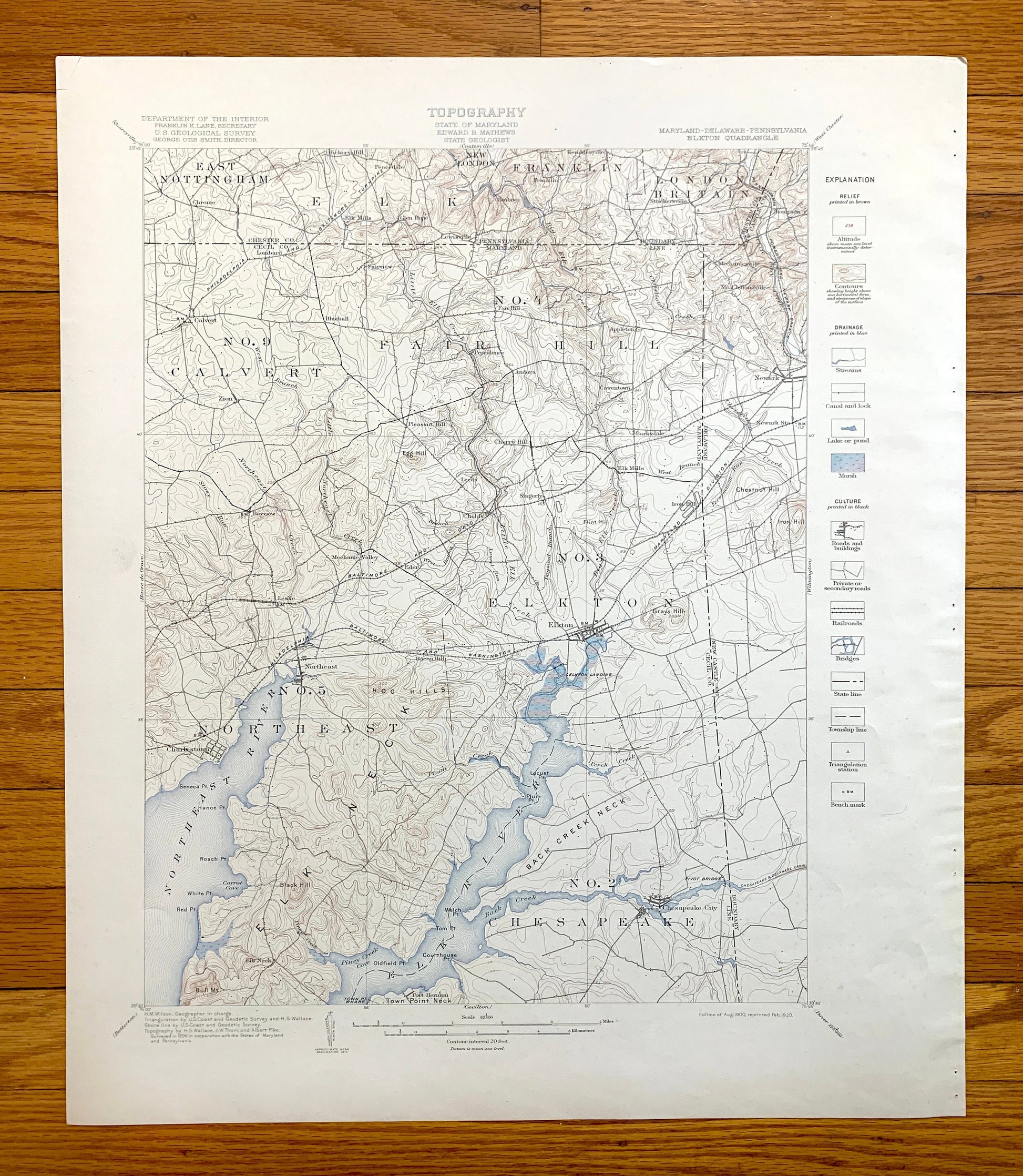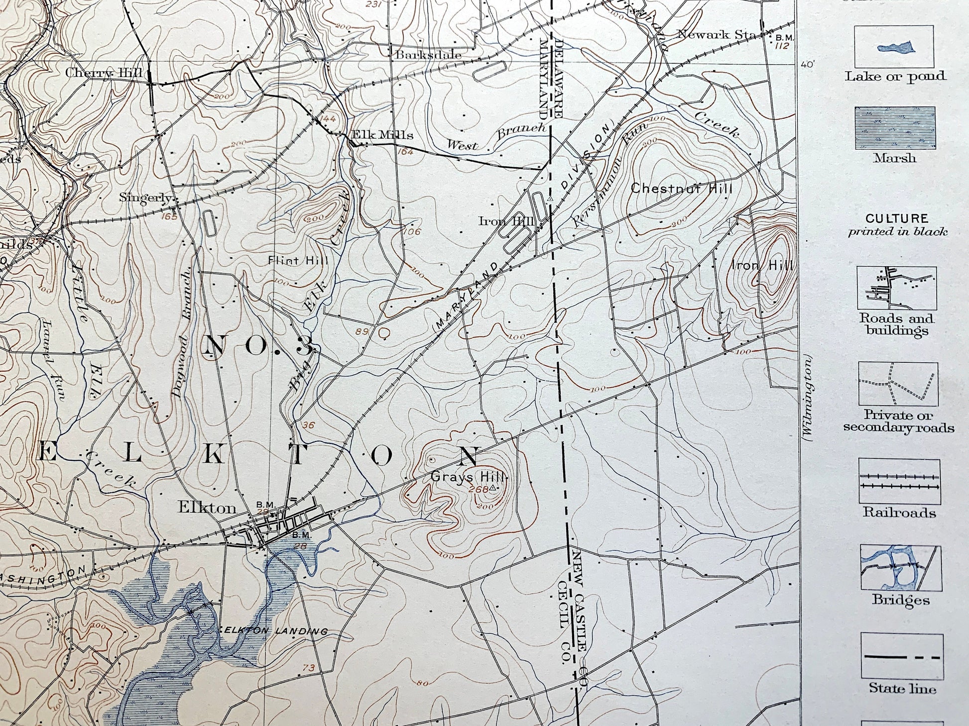 Beautiful, antique map of Elkton, Maryland and surrounding Cecil County (MD), New Castle County (DE), and Chester County (PA). This is an authentic 1900 edition, 1920 print from the U.S. Geological Survey and NOT a computer reproduction. It is from a Geologic Atlas folio.