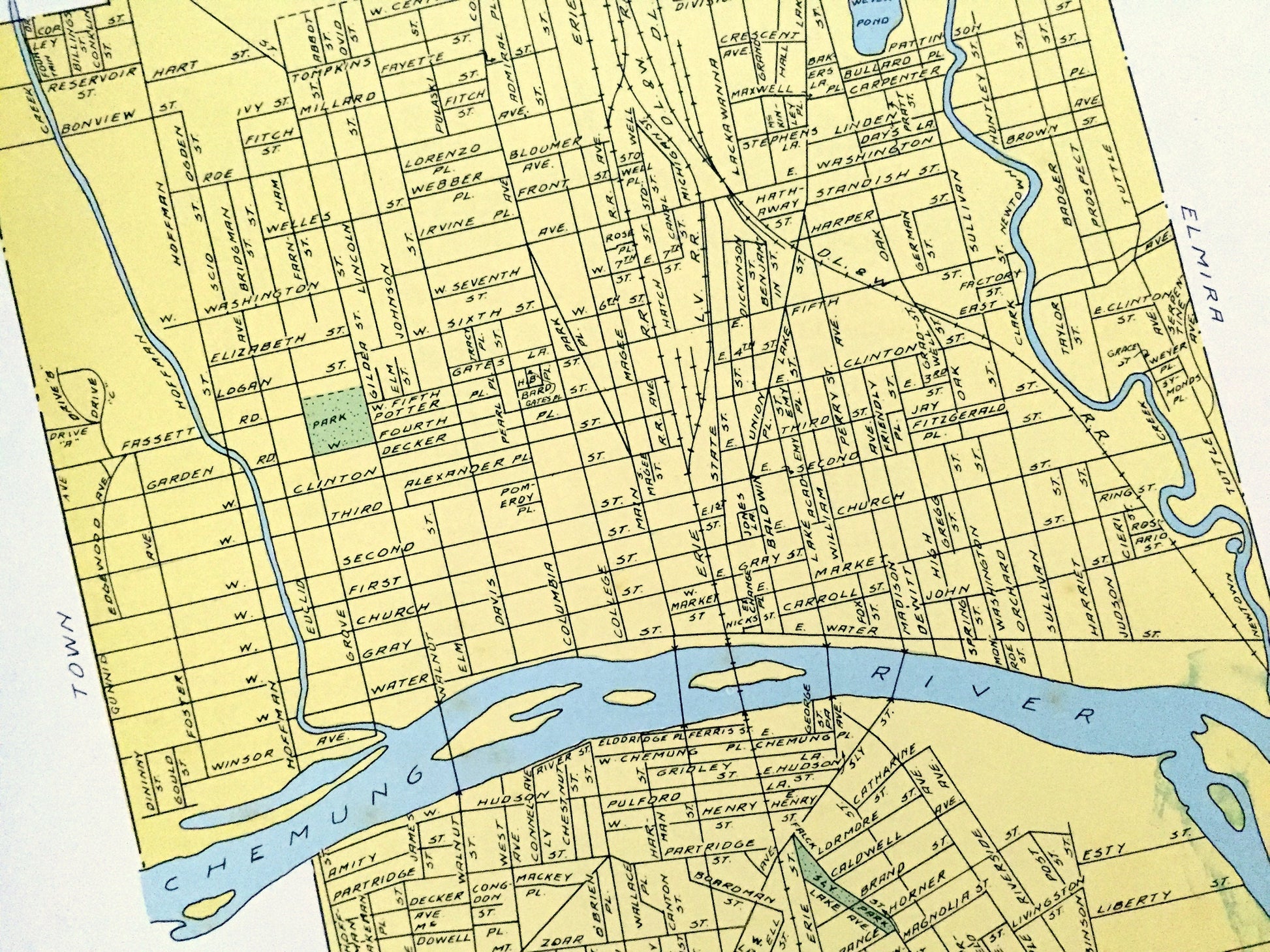 Beautiful, antique street map of the cities of Elmira & Dunkirk, New York. This is an authentic print taken from the rare "Historical Atlas of New York State" by William P. Munger, published by Frank E. Richards Co. in 1941, and is NOT a computer reproduction.