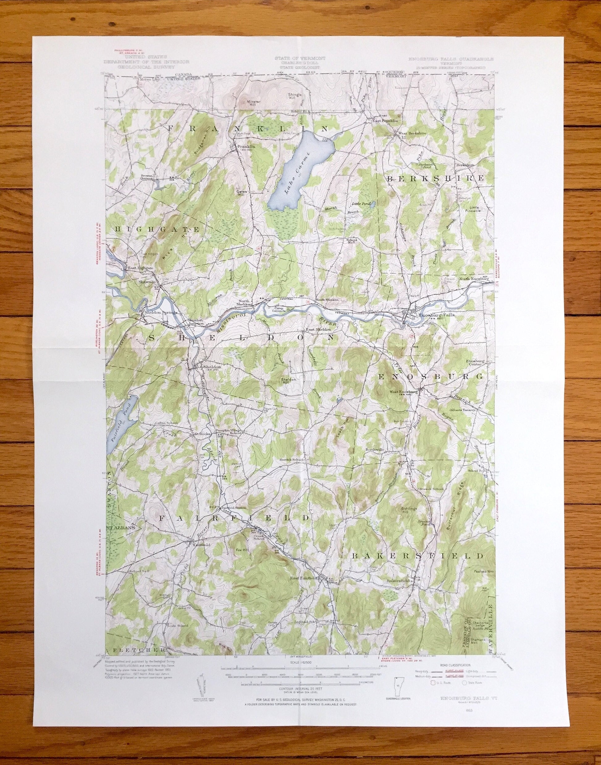 Beautiful, antique map of Enosburg, Sheldon, Fairfield, Berkshire, Bakersfield, Vermont and surrounding Franklin County area on the Canadian border. This is an authentic 1953 edition, 1955 print from the U.S. Geological Survey and NOT a computer reproduction.