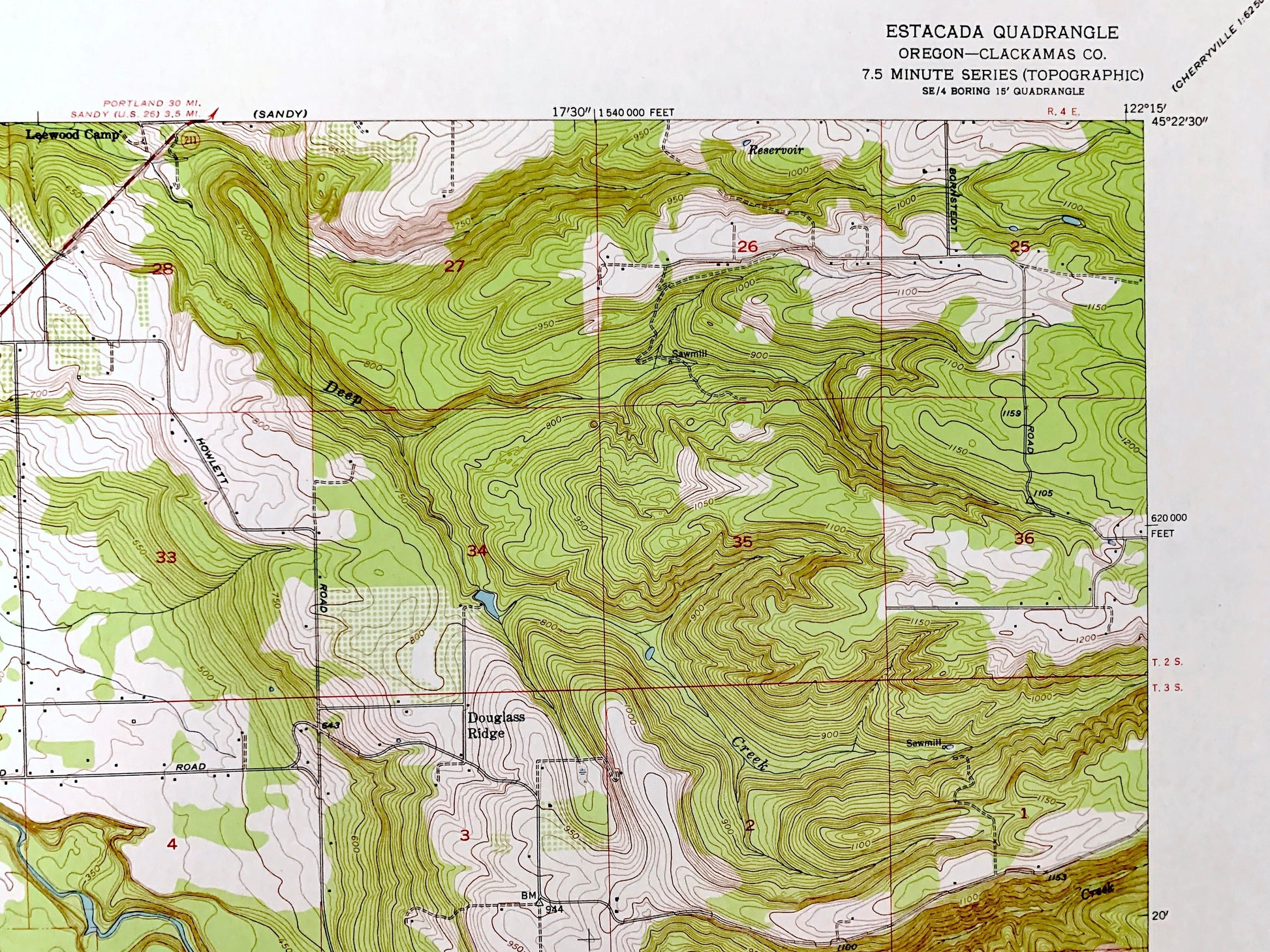 Beautiful, antique map of Estacada, Oregon and surrounding Clackamas County area. This is an authentic 1954 edition, 1956 print from the U.S. Geological Survey and NOT a computer reproduction.