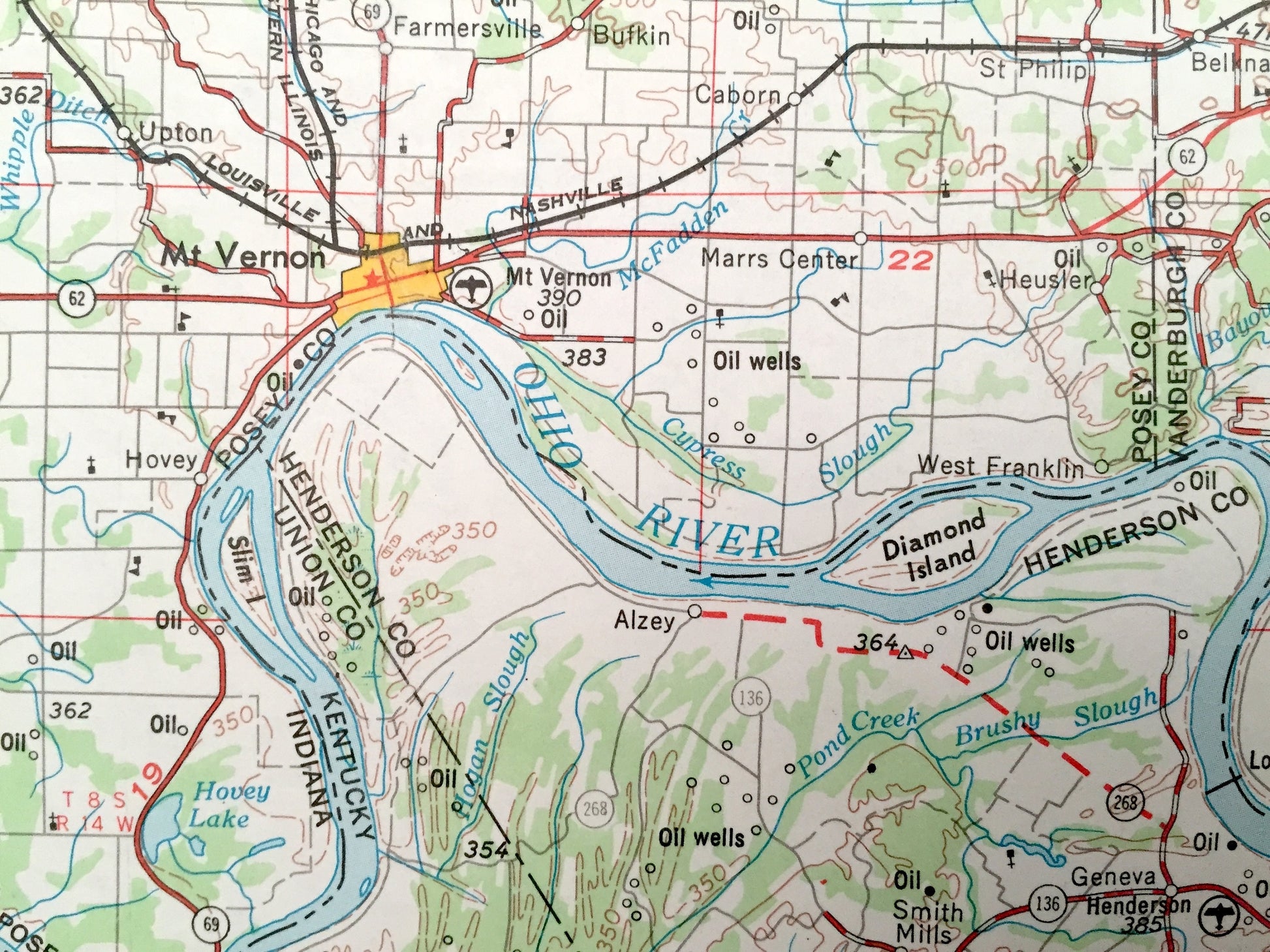 Points of Interest: INDIANA - Ohio River, Hoosier National Forest, Eagle Creek, McFadden Creek, Hovey Lake and lots more hills, mountains, lakes, creeks, roads highways and railroads.