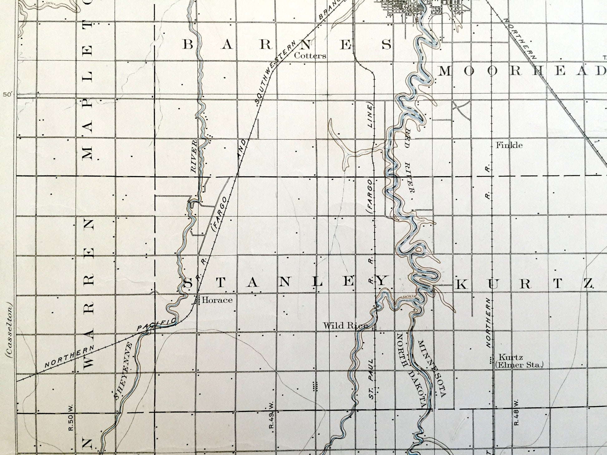 Points of Interest: Cass County, Richland County, Clay County, Wilkin County, Red River of the North, Wild Rice River, Maple River, Buffalo River, Deerhorn Creek, Sheyenne River, Chicago Milwaukee and St Paul Railroad and lots more farms, creeks, towns, roads and train tracks.