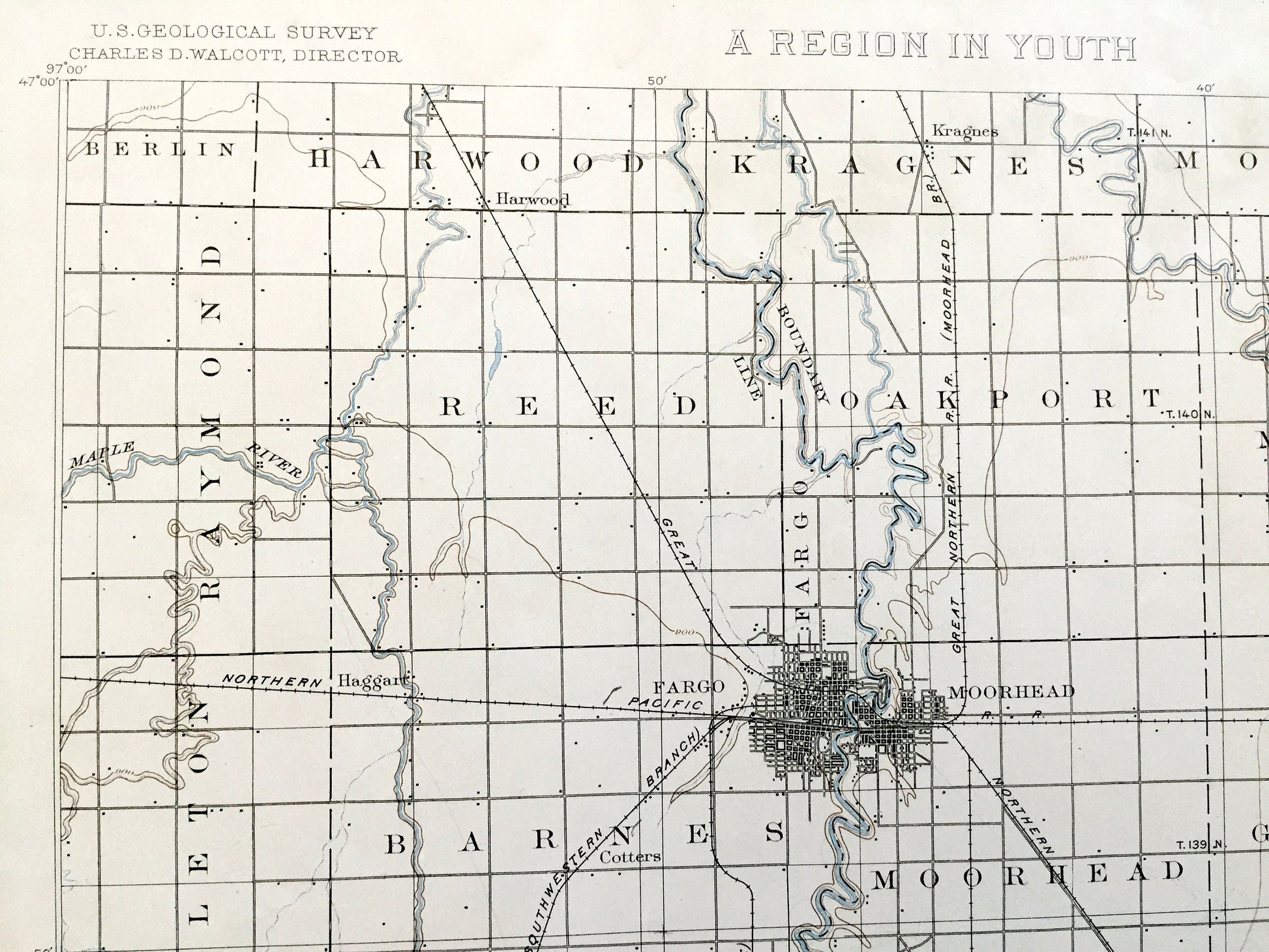Beautiful, antique map of Fargo, North Dakota and Moorhead, Minnesota and surrounding Cass, Richland, Clay & Wilkin County area. This is an authentic 1894 edition, 1894 print from the U.S. Geological Survey and NOT a computer reproduction. It is from a Geologic Atlas folio and features the charming and unique heading "A Region in Youth."