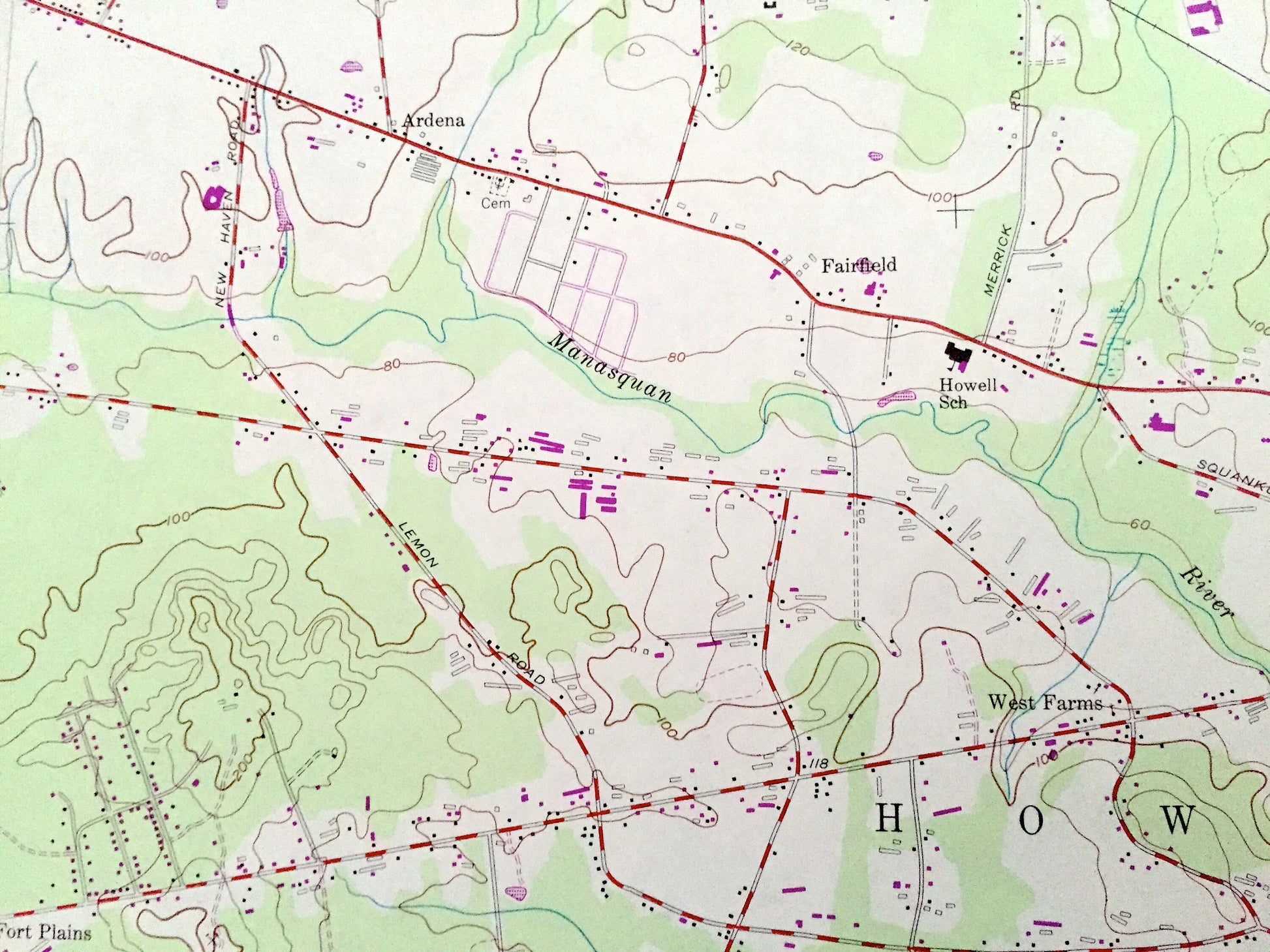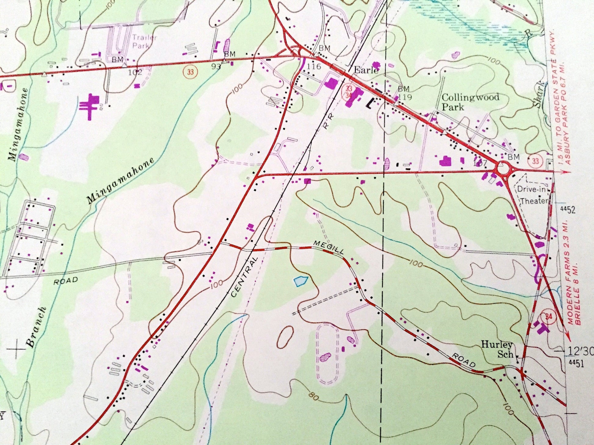 Points of Interest: U.S. Navy Reservation Earle Ammunition Depot, Penn Central, Allaire State Park, Garden State Parkway, Central Railroad of New Jersey, cranberry bogs, cemeteries, Camp Housman, golf courses, county airport, Applegates Creek, Aldrich Lake, Hay Stack Brook, Dicks Brook, Echo Lake, Lake Louise, Bear Swamp Brook, Squankum Brook, Muddy Ford Brook, Mingamahone Brook, Manasquan River, Shark River, Burks Creek, and many more hills, streams, ponds, houses, schools, railroads, churches and roads.