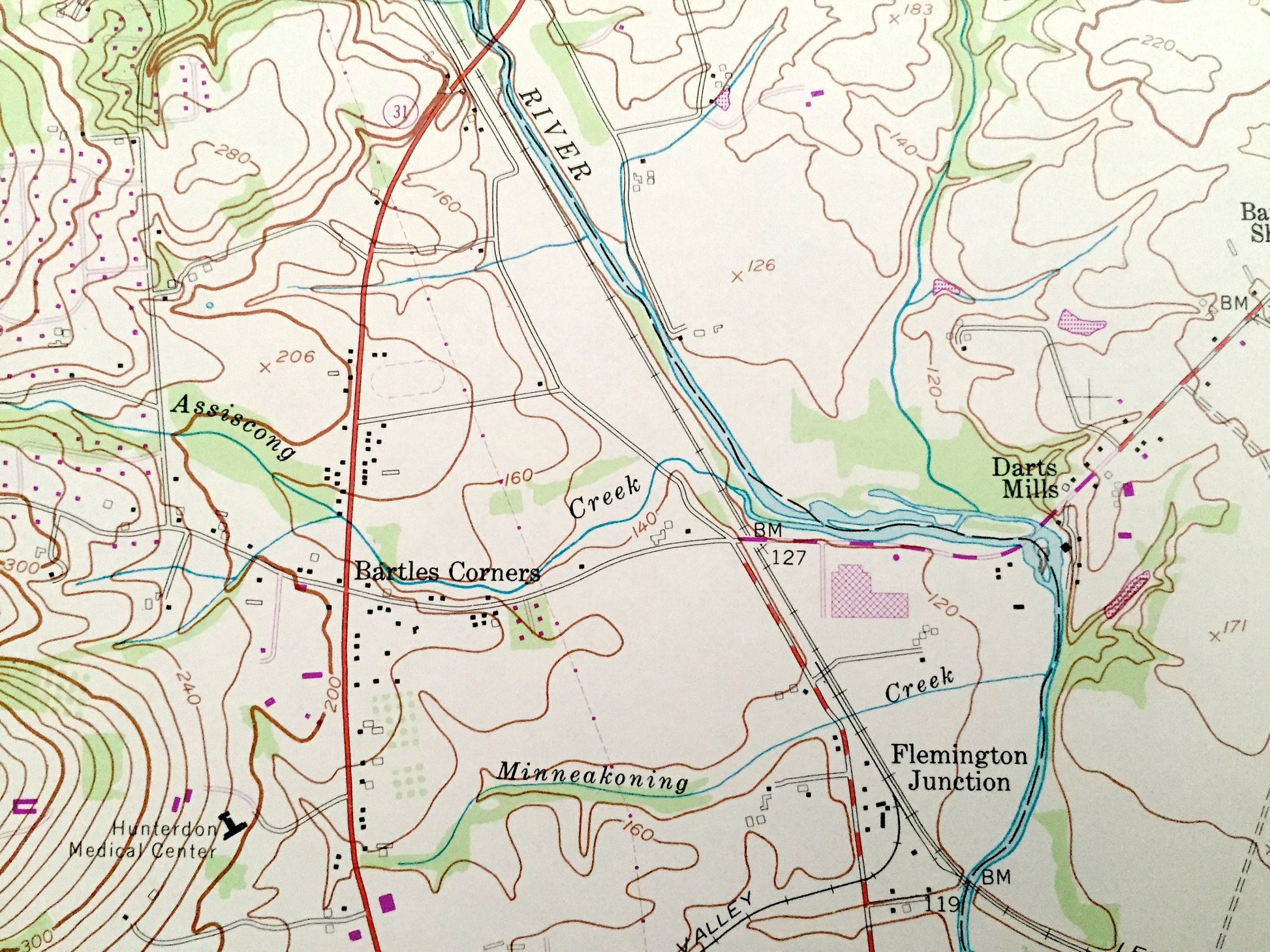 Points of Interest: Raritan River, Round Mountain, Cushetunk Mountain, Cushetunk Lake, Holland Brook, Pleasant Run Creek, Round Valley Reservoir, Echo Hill Camp, Hunterdon Medical Center, Central Railroad of New Jersey, Red Rock Lake, and many more hills, streams, ponds, houses, schools, railroads, churches and roads.