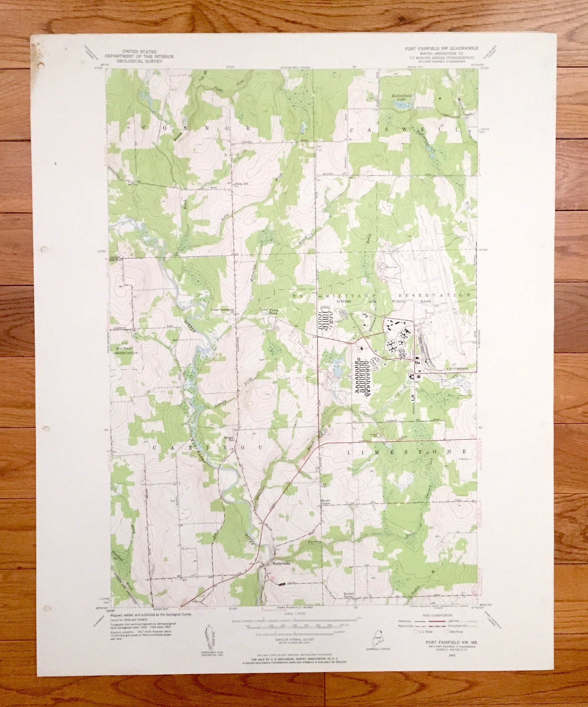 Beautiful, antique map of Fort Fairfield NW, Maine and surrounding Aroostook County area. This is an authentic 1953 edition, 1955 print from the U.S. Geological Survey and NOT a computer reproduction.