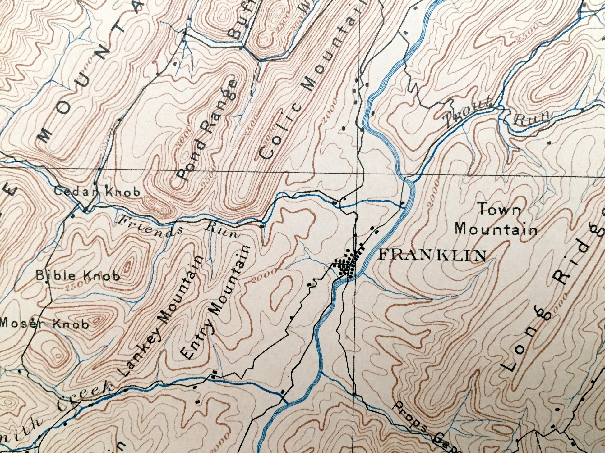 Beautiful, antique map of Franklin, West Virginia and surrounding Virginia and Pendleton, Tucker, Grant, Randolph, Hardy, and Rockingham County area. This is an authentic 1896 edition, 1899 print from the U.S. Geological Survey and NOT a computer reproduction.