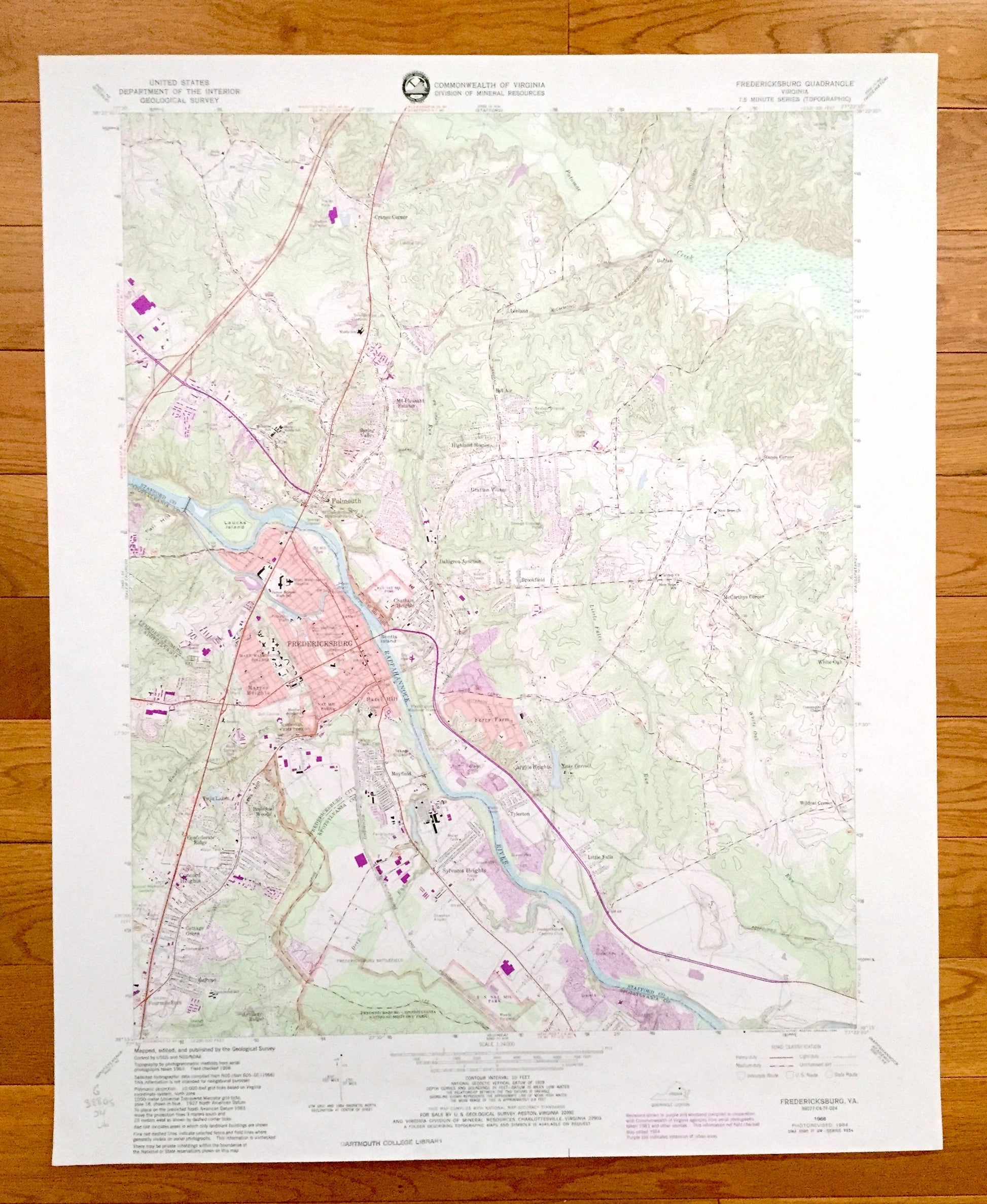 Beautiful, antique map of Fredericksburg, Virginia and surrounding Stafford & Spotsylvania County area on the Rappahannock River. This is an authentic 1966 edition, 1984 print from the U.S. Geological Survey and NOT a computer reproduction.