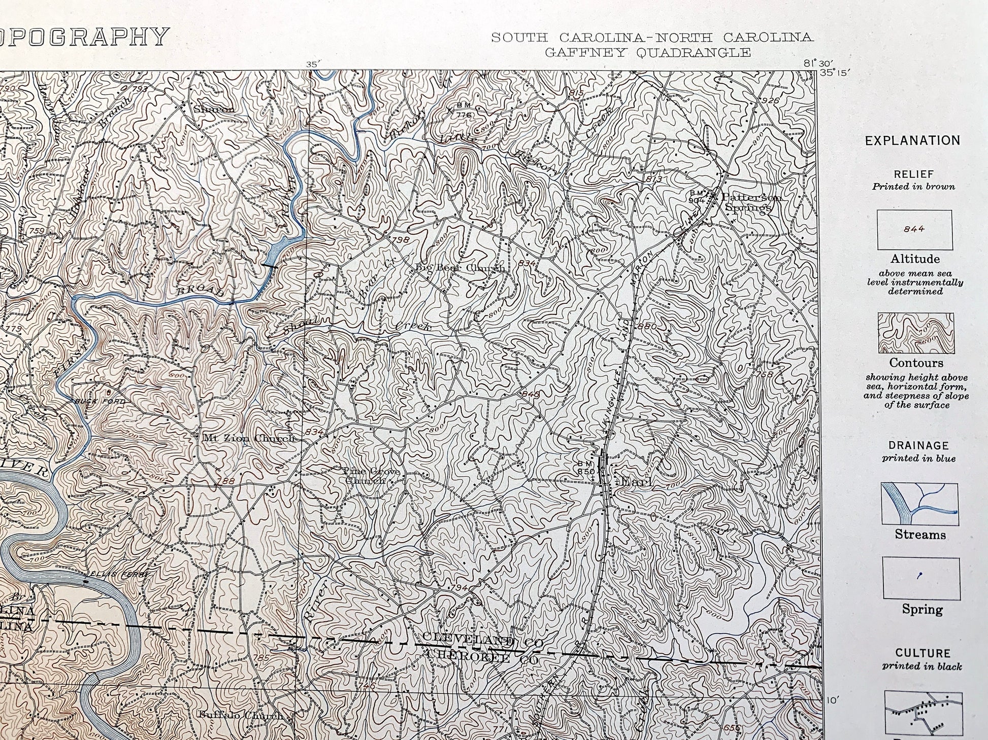 Beautiful, antique map of Gaffney, South Carolina and surrounding Cherokee County (SC) and Cleveland County (NC) area. This is an authentic 1909 edition, 1931 print from the U.S. Geological Survey and NOT a computer reproduction. It is from a Geologic Atlas folio.