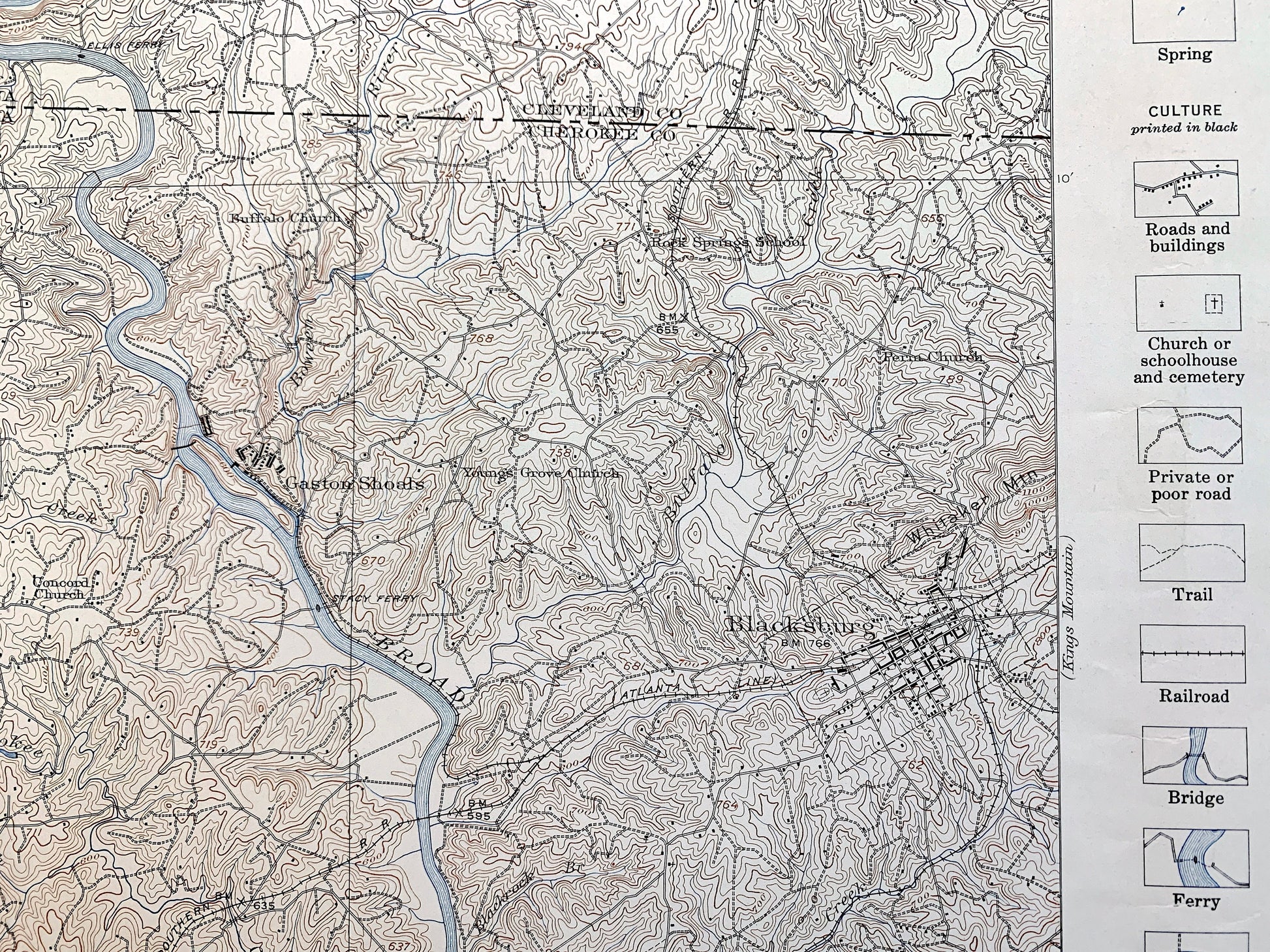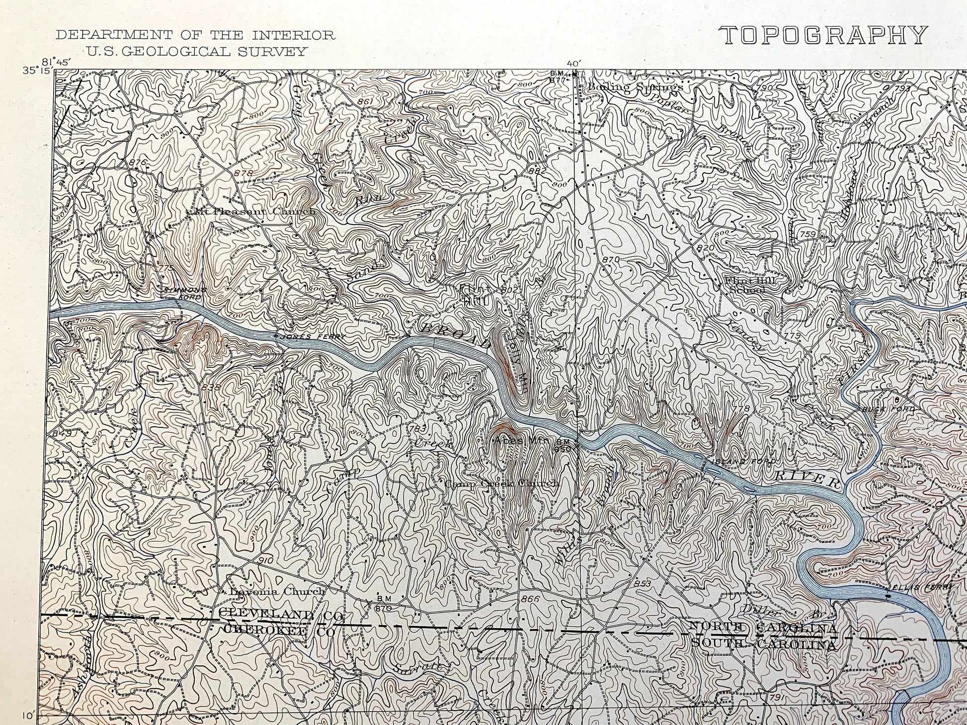 Points of Interest: Cherokee County (SC), Cleveland County, Ninety-Nine Islands, Broad River, Cherokee Creek, Buffalo Creek, Silver Mine Ridge, Whitaker Mountain, and many more towns, houses, roads, train tracks and creeks.