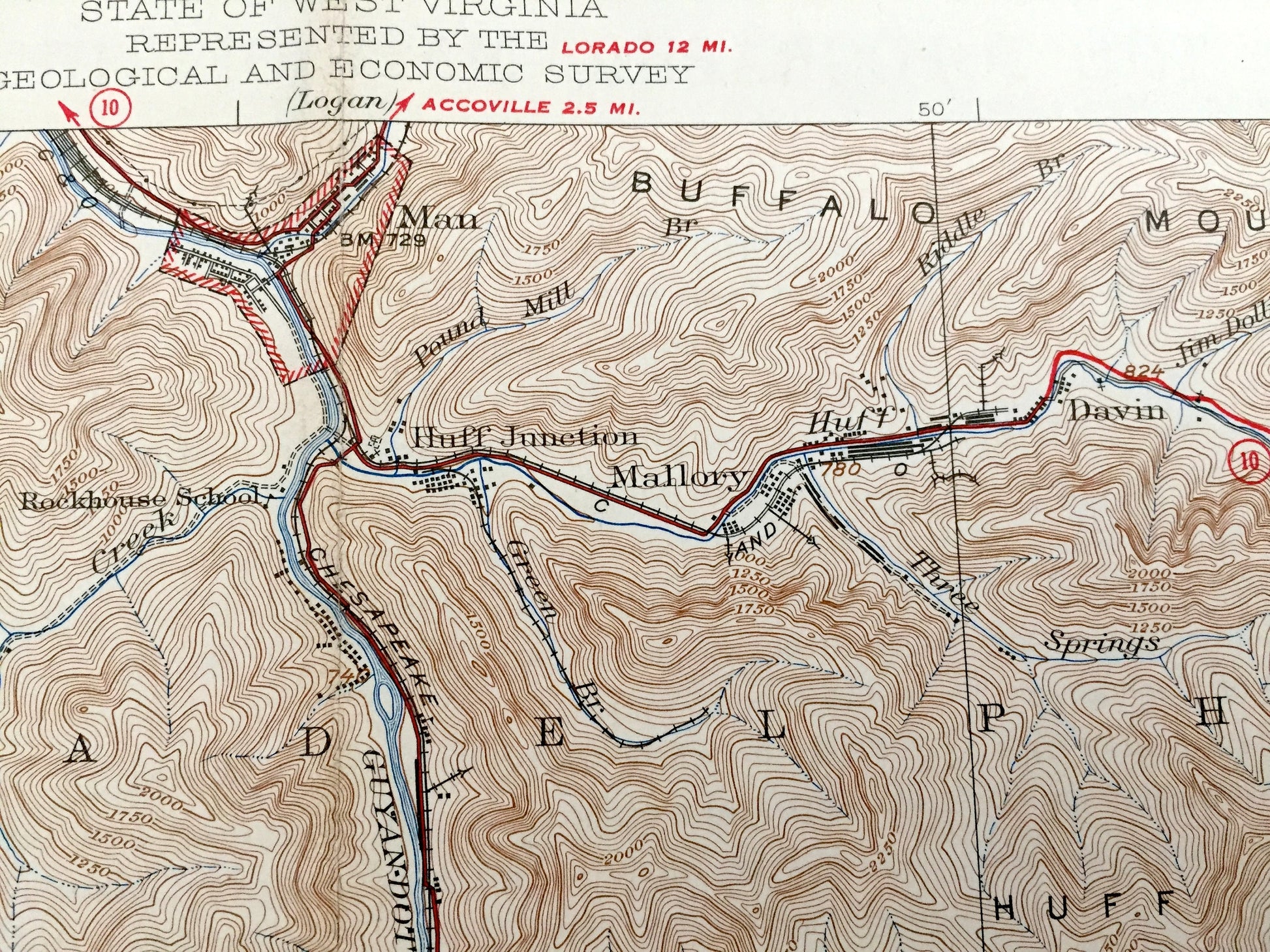 Points of Interest: Guyandot River, Elk Creek, Tug Fork, Alum Mountain, Huff Mountain, Chesapeake & Ohio Railway, Buffalo Mountain, Norfolk & Western Railway, and lots more hills, mountains, creeks, towns, roads and train tracks.