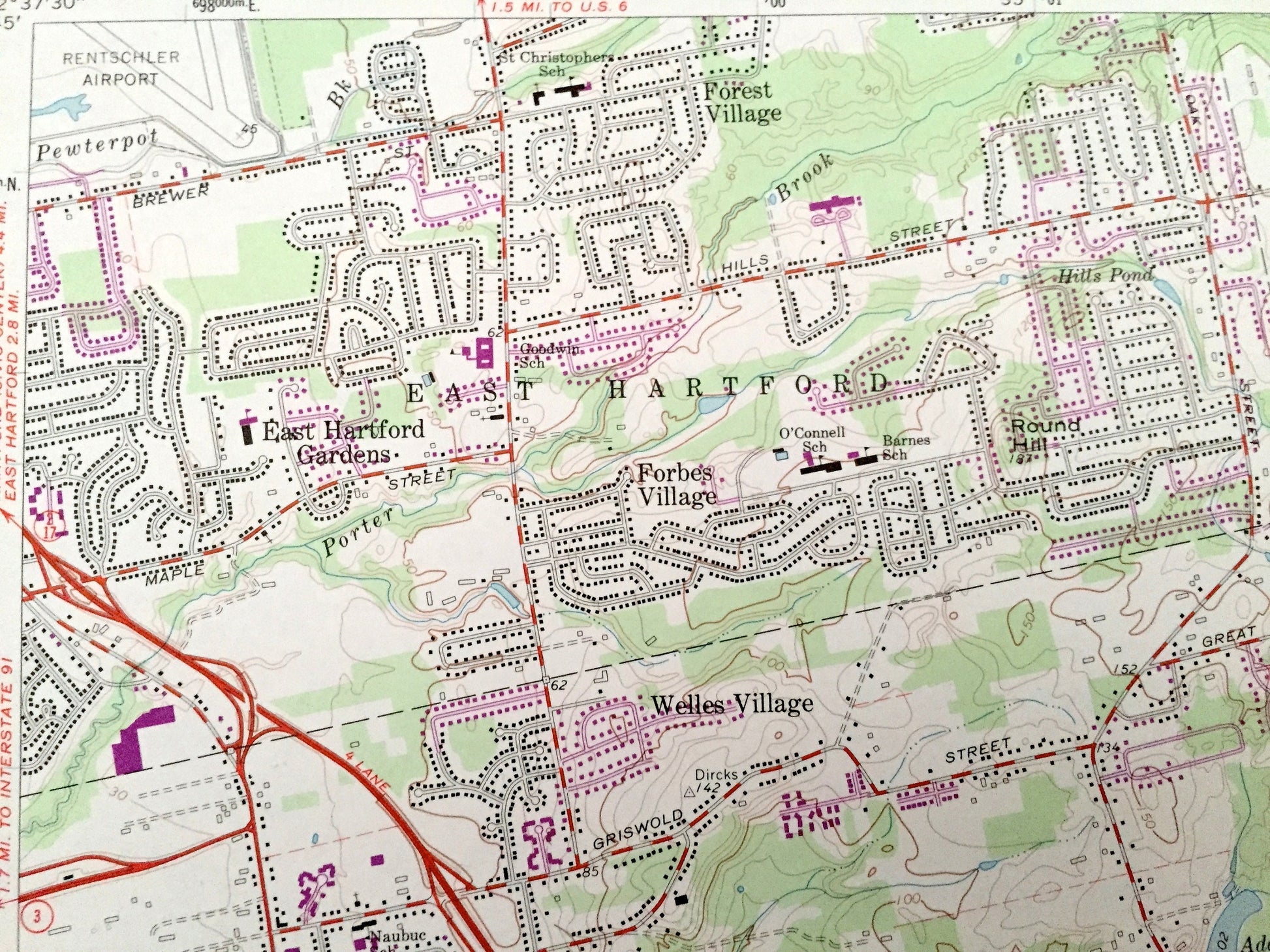 Points of Interest: Rentschler Airport, Meshomasic State Forest, Camp Bennett, Minnechaug Mountain, Bush Hill, Belltown Hill, Kongscut Mountain, Meshomasic Mountain, Glastonbury Meadows, Connecticut River, Salmon Brook, Porter Brook, Roaring Brook, Wintergreen Brook, Holland Brook, Hollow Brook, Red Gates Pond, Addison Pond, Cold Brook Reservoir, Angus Park Pond, Great Pond, Potter Pond, and many more hills, streams, ponds, houses, schools, railroads, churches and roads.