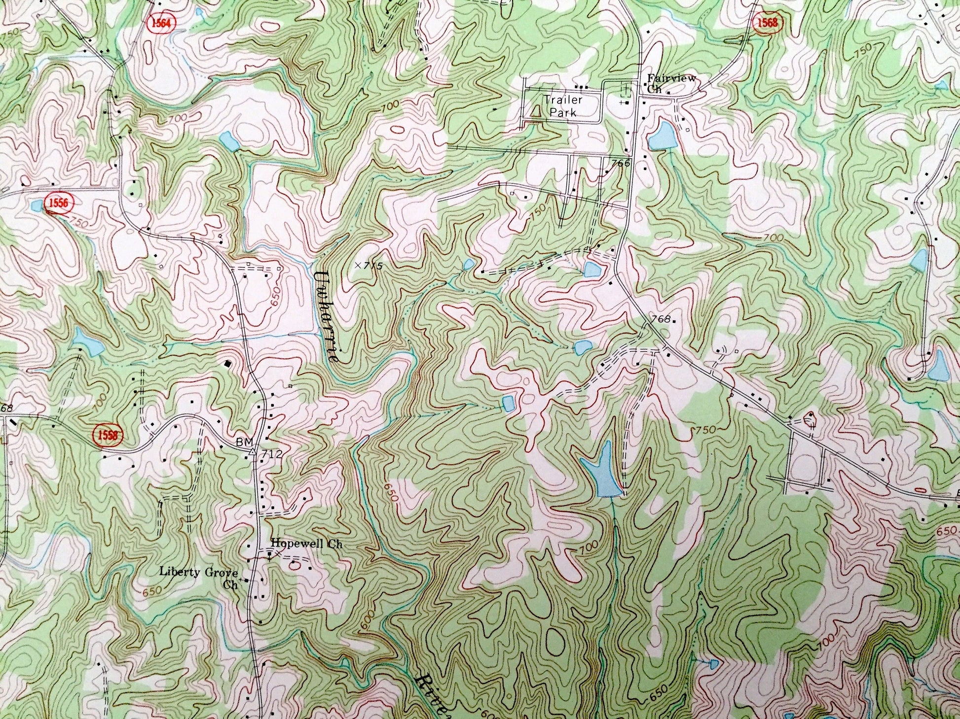 Points of Interest: Shepherd Mountain, Caraway Mountain, Uwharrie River, Caraway Creek, Camp Caraway, Mt Shepherd Camp, Munro Vista, Little Caraway Creek, and many more hills, streams, ponds, houses, schools, railroads, churches and roads.