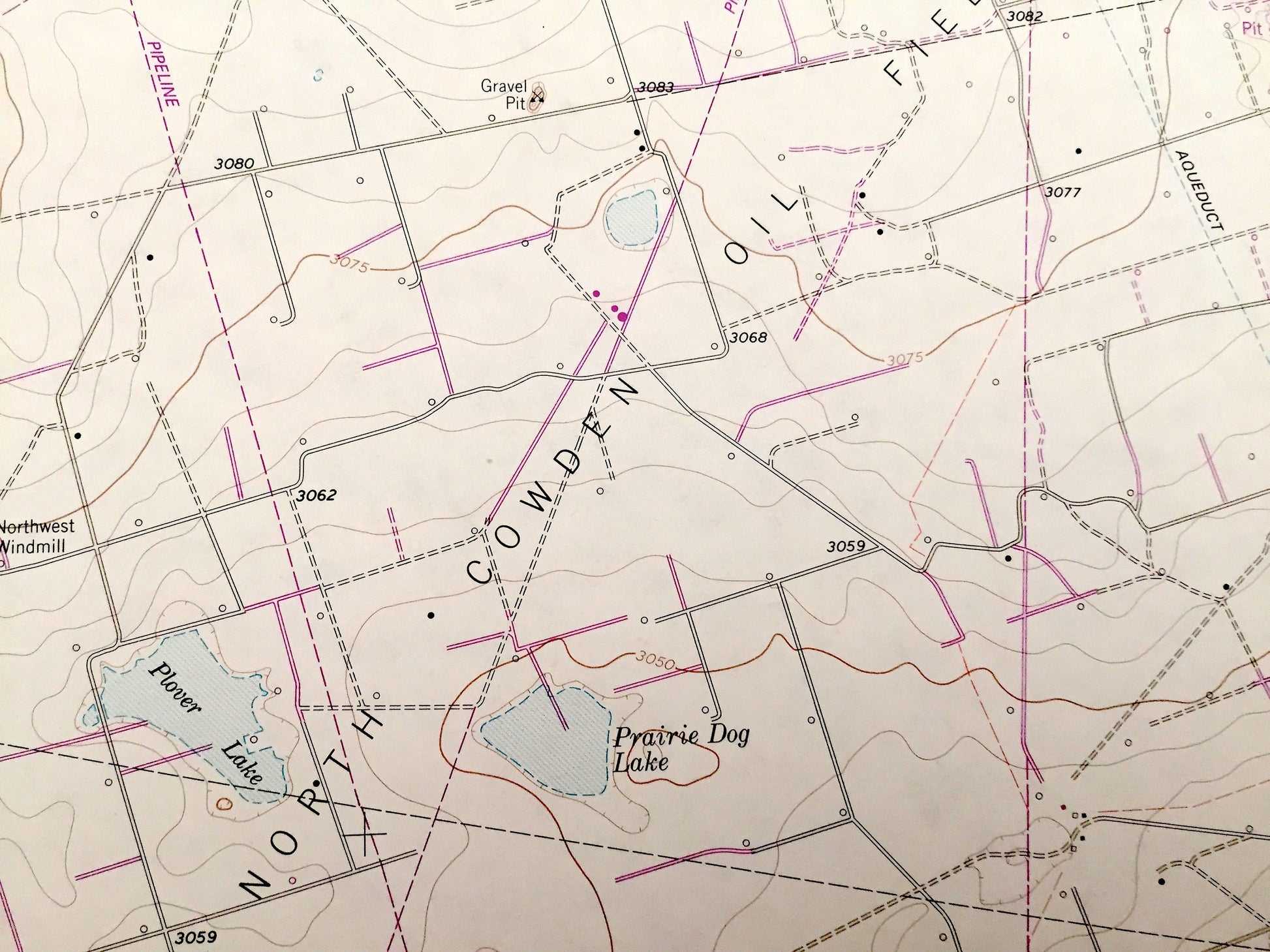 Points of Interest: Goldsmith Oil Field, North Cowden Oil Field, Donnelly North Oil Field, Lawson Oil Field, Johnson Oil Field, Gulf Camp Windmill, Northwest Lake, James Lake, Mowing Machine Lake, Antelope Lake, Prairie Dog Lake, Coyote Lake, Burkett Windmill, Cherry Windmill, and many more roads, windmills, and houses.