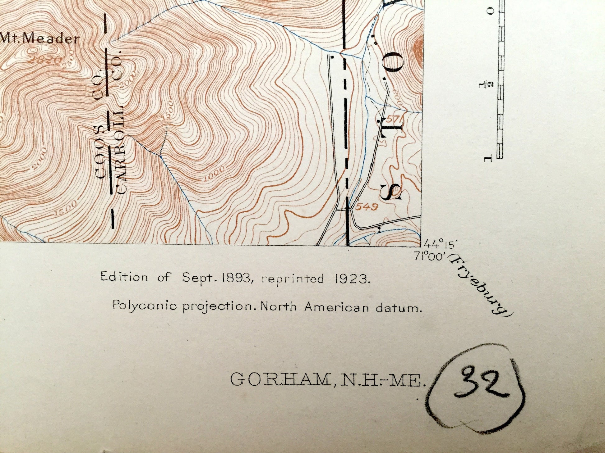 Beautiful, antique map of White Mountain Region, New Hampshire, including Shelburne, Bean Purchase, Chatham, Success, Berlin, and Gorham. This is an authentic 1893 edition, 1923 print from the U.S. Geological Survey and NOT a computer reproduction.