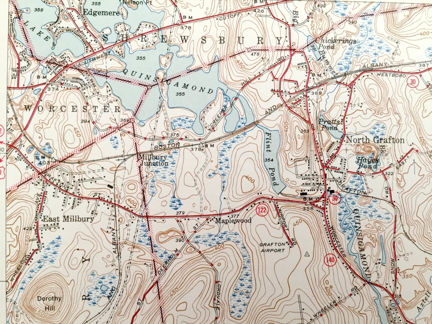 Points of Interest: Lake Quinsigamond, Fay Mountain, Silver Lake, Lake Ripple, Boston and Albany Railroad, Milbury Junction, Fisherville Pond, Blackstone River, New York New Haven and Hargord Railroad, Harback School, State Fish Hatchery, Carpenter Reservoir, and more roads, houses, ponds, hills, streams and mountains.