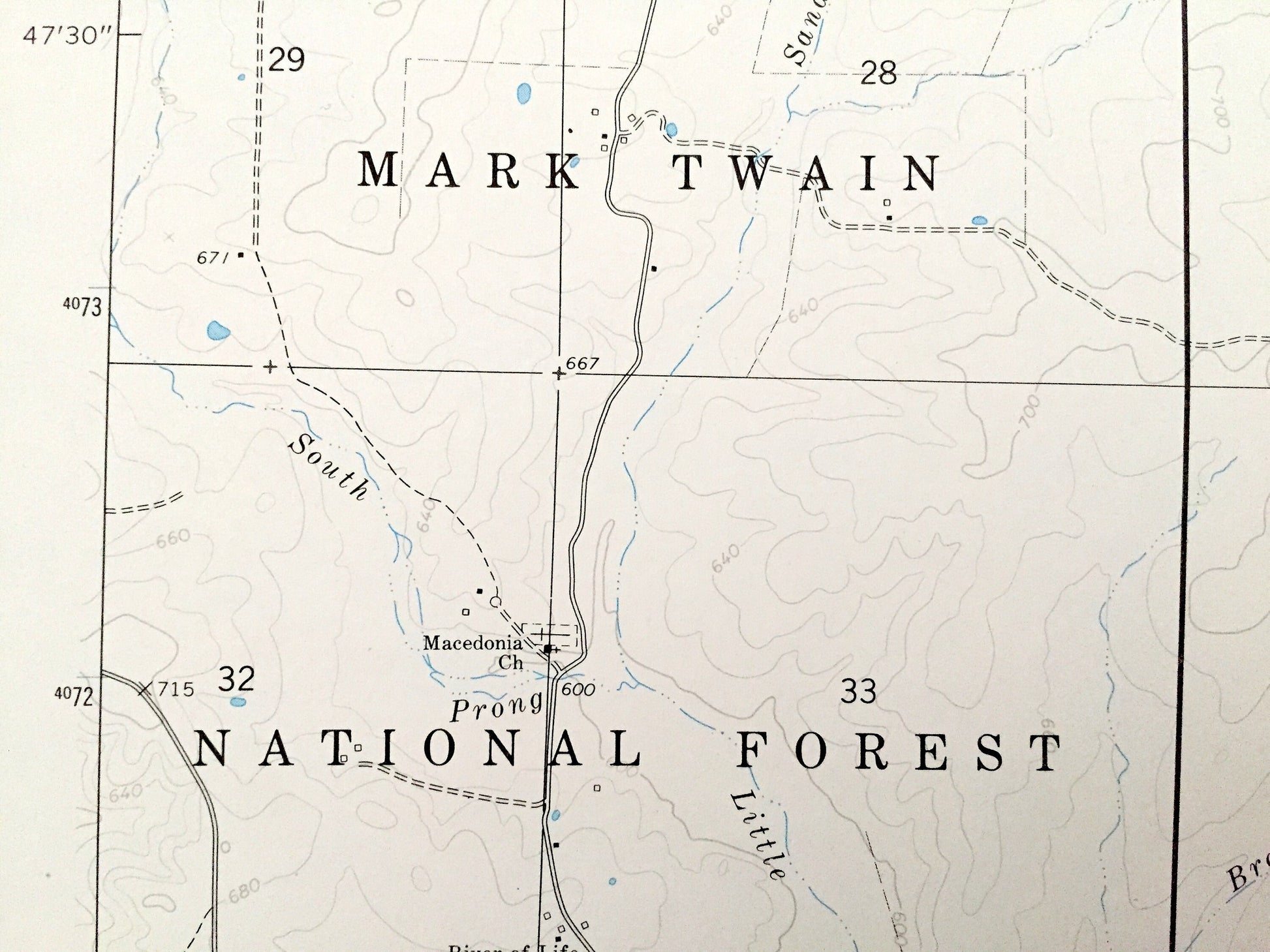 Points of Interest: Mark Twain National Forest, Hickory Hollow, Barnett Hollow, Coon Hollow, Campground Hollow, Walnut Grove Hollow, Way Hollow, Devils Backbone, Pothole Hollow, Gables Ridge, Greenville Hollow, North Prong, Little Black River, Sanders Creek, Spring Branch, Barton Branch, Mud Branch, Mill Creek, Tenmile Creek, and many more hills, streams, ponds, houses, schools, railroads, churches and roads.