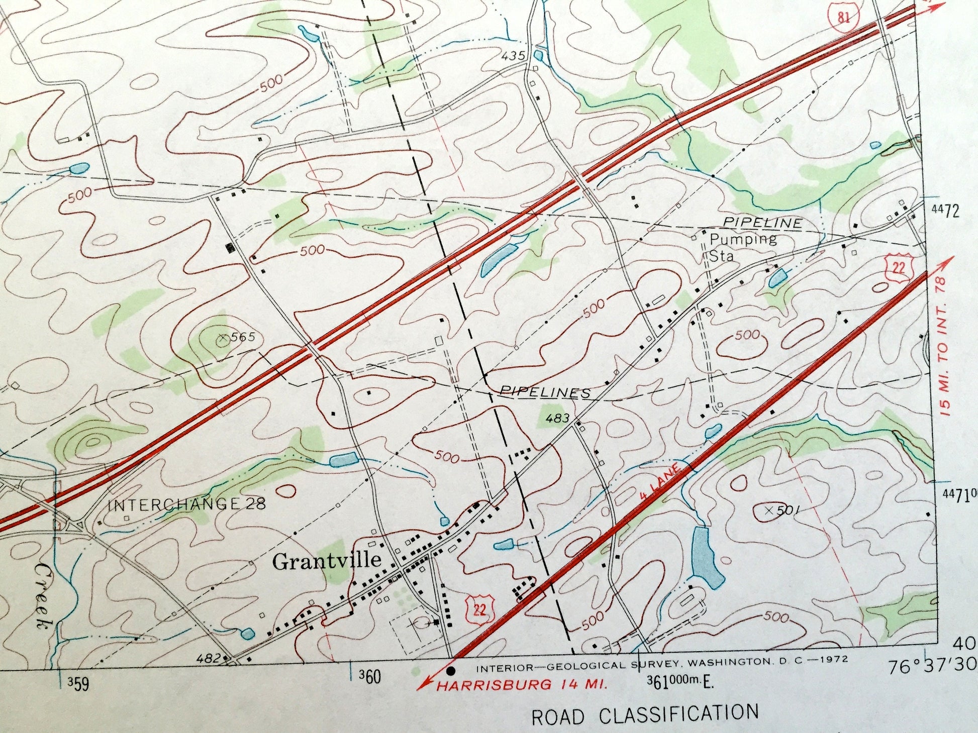 Beautiful, antique map of Grantville, Pennsylvania and surrounding Dauphin County and Lebanon County areas. This is an authentic 1969 edition, 1972 print from the U.S. Geological Survey and NOT a computer reproduction.