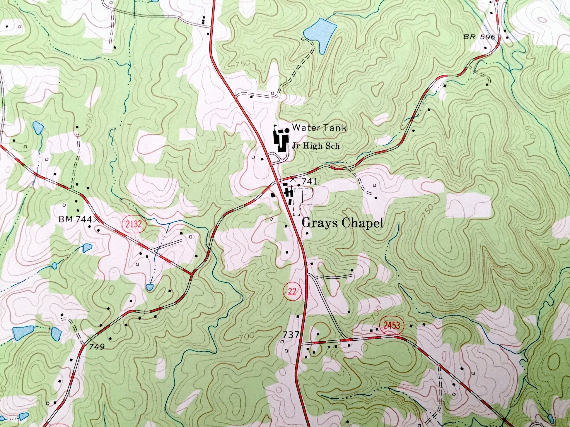 Beautiful, antique map of Grays Chapel, North Carolina and surrounding Randolph County areas. This is an authentic 1974 edition, 1977 print from the U.S. Geological Survey and is NOT a computer reproduction.