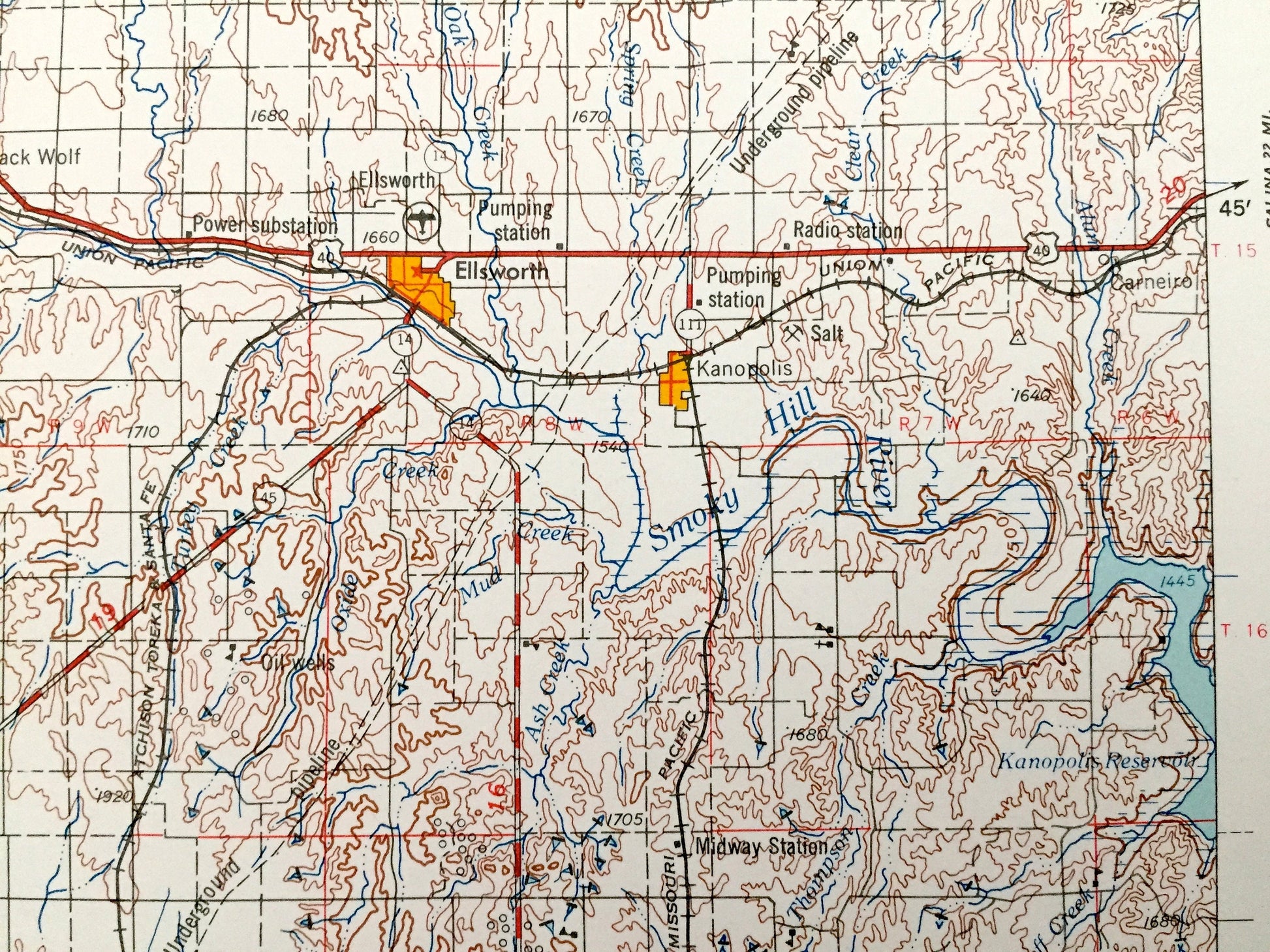 Points of Interest: Arkansas River, Pawnee River, Smoky Hill River, Walnut Creek, Big Timber Creek, Big Creek, Cedar Bluff Reservoir, Kanopolis Reservoir and lots more hills, mountains, rivers, lakes, creeks, roads, highways and railroads.