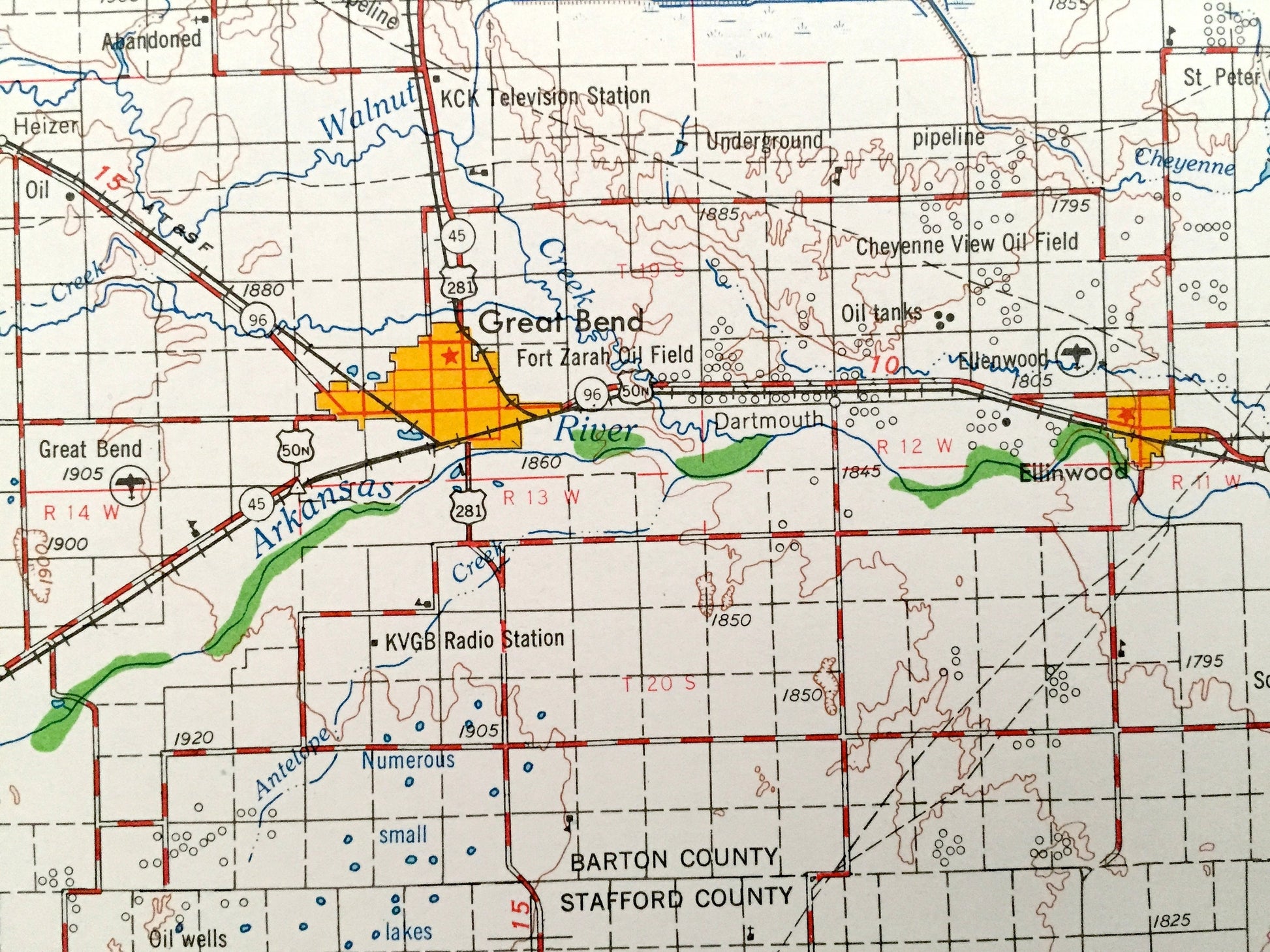 Beautiful, antique map of Great Bend, Kansas and surrounding area. This is an authentic 1958 edition, 1958 print from the U.S. Geological Survey and NOT a computer reproduction.