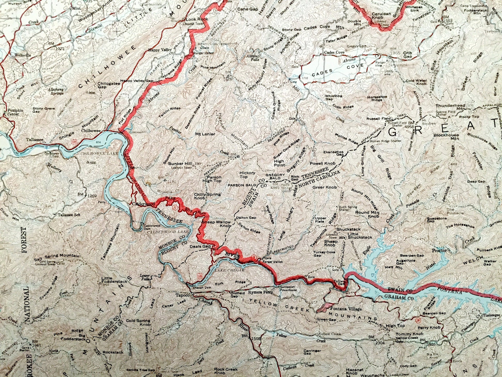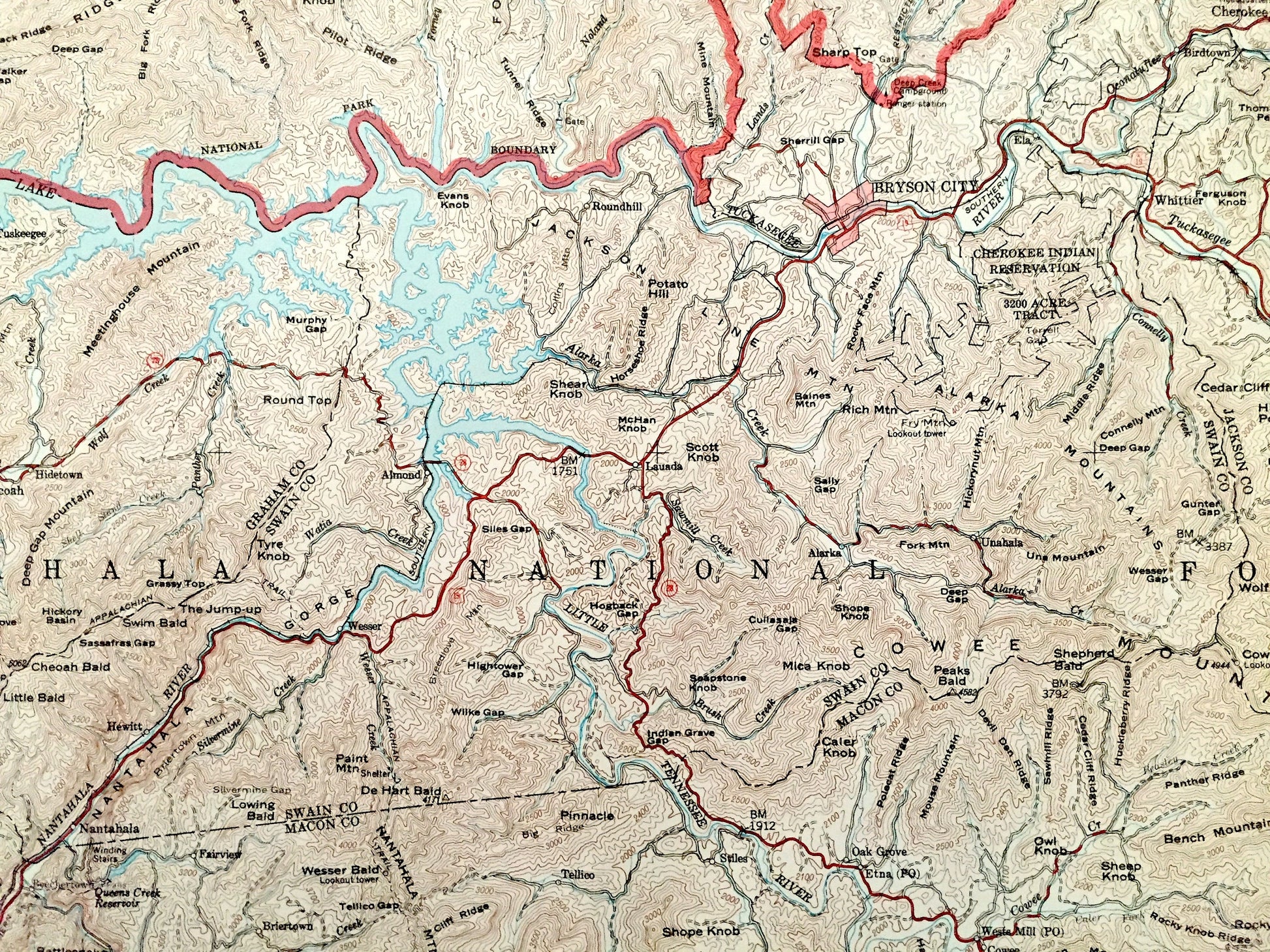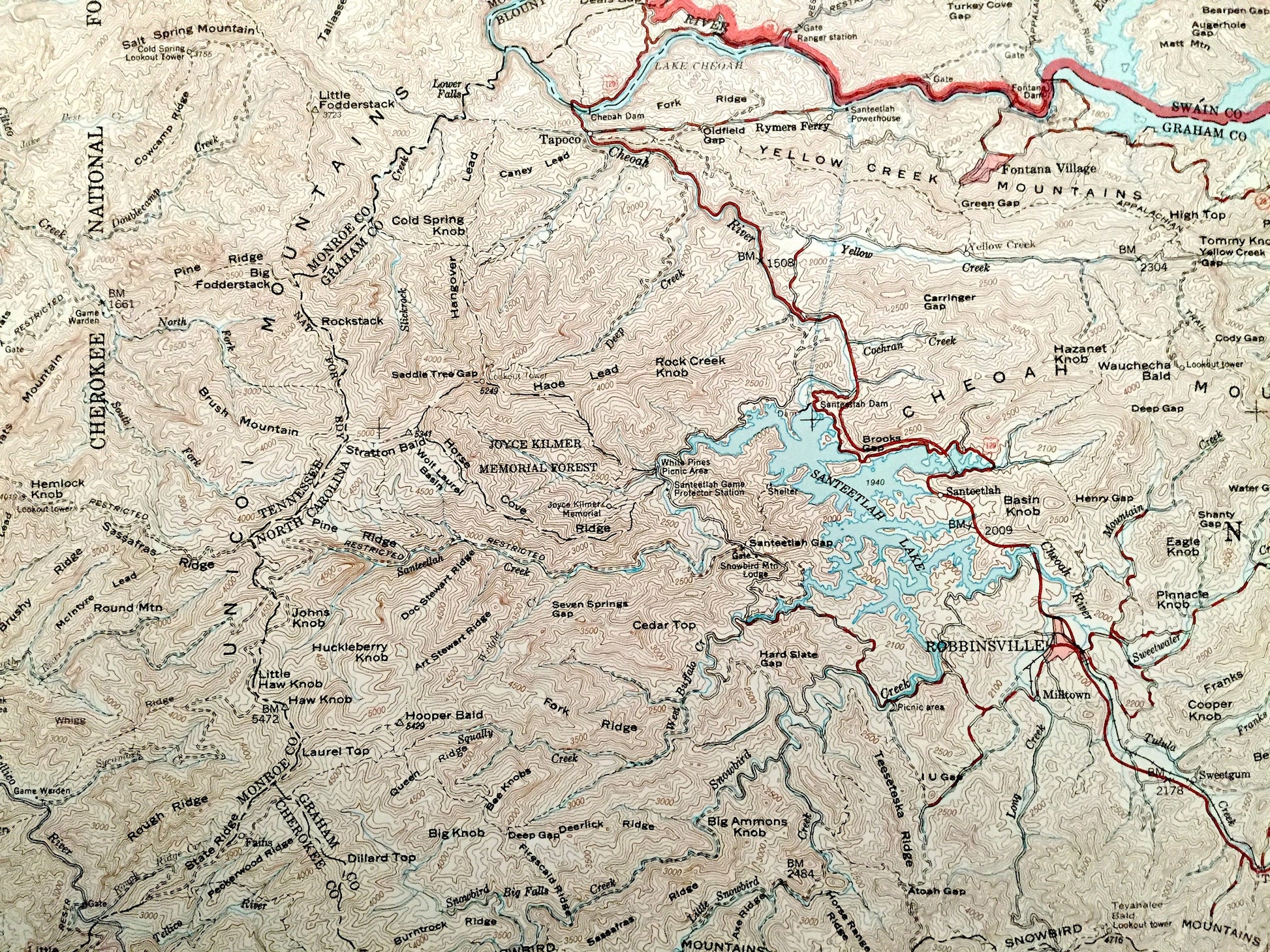 North Carolina - Great Smokey Mountains, Cheoah Mountains, Snowbird Mountains, Alarka Mountains, Nantahala National Forest, Pisgah National Forest, Cherokee National Forest, Nantahala River, Tuckasegee River, Santeetlah Lake, Cherokee Indian Reservation and lots more hills, mountains, lakes, islands, bays, highways, railroads.