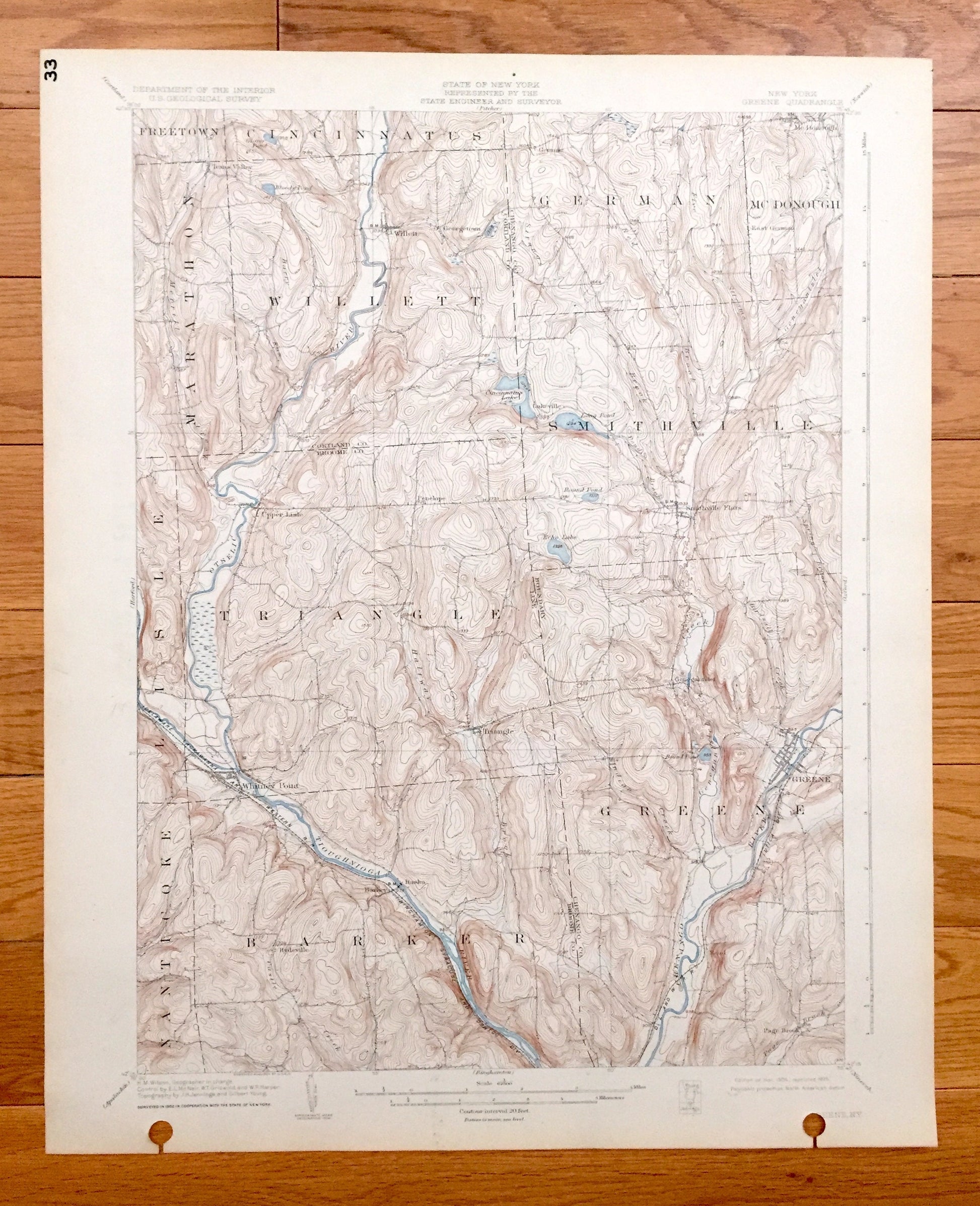 Beautiful, antique map of Greene, New York and surrounding Cortland, Chenango & Broome County areas. This is an authentic 1904 edition, 1925 print from the U.S. Geological Survey and NOT a computer reproduction.
