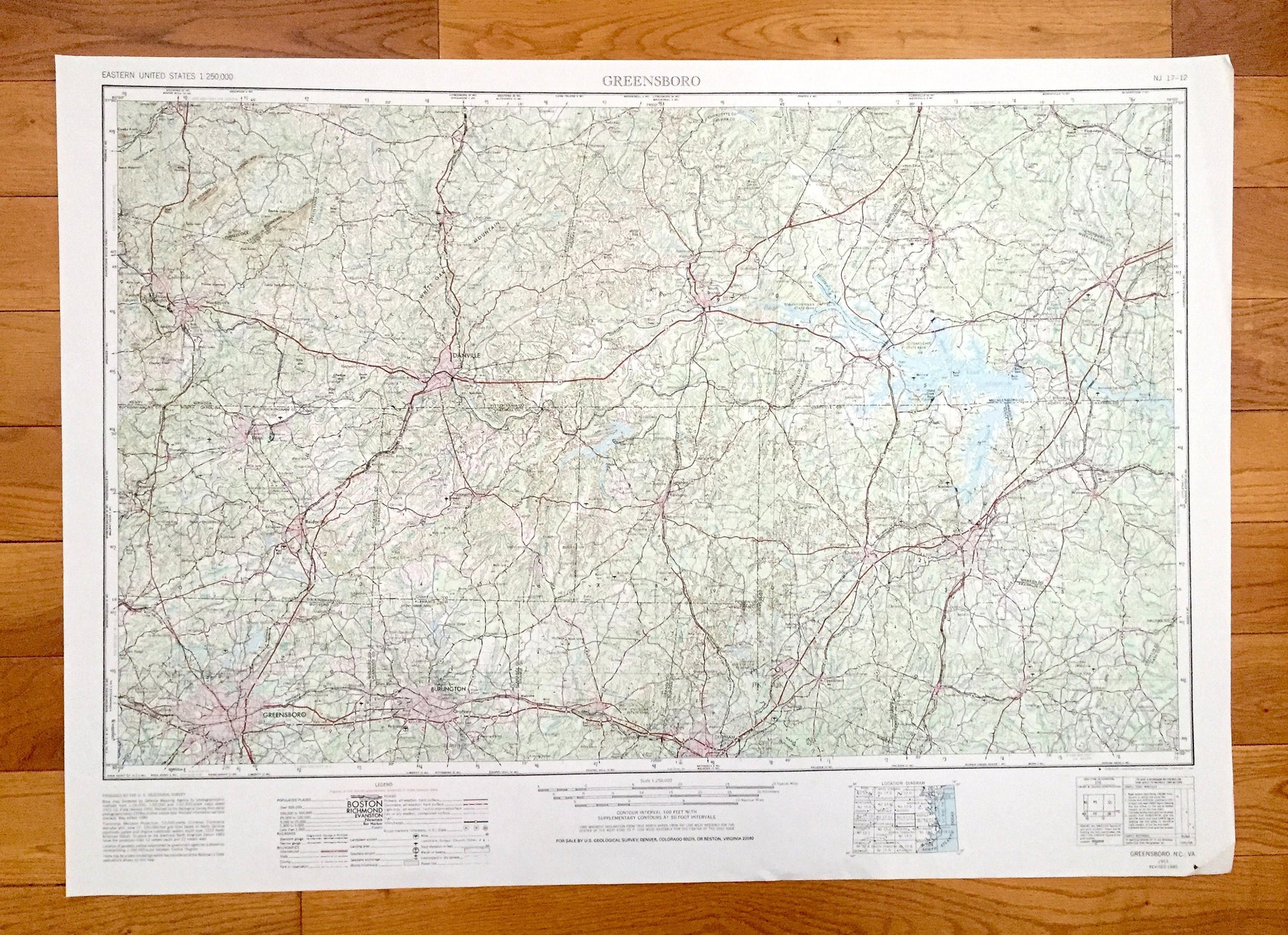 Beautiful, antique map of Greensboro, North Carolina and surrounding Virginia areas. This is an authentic 1953 edition, 1981 print from the U.S. Geological Survey and NOT a computer reproduction.