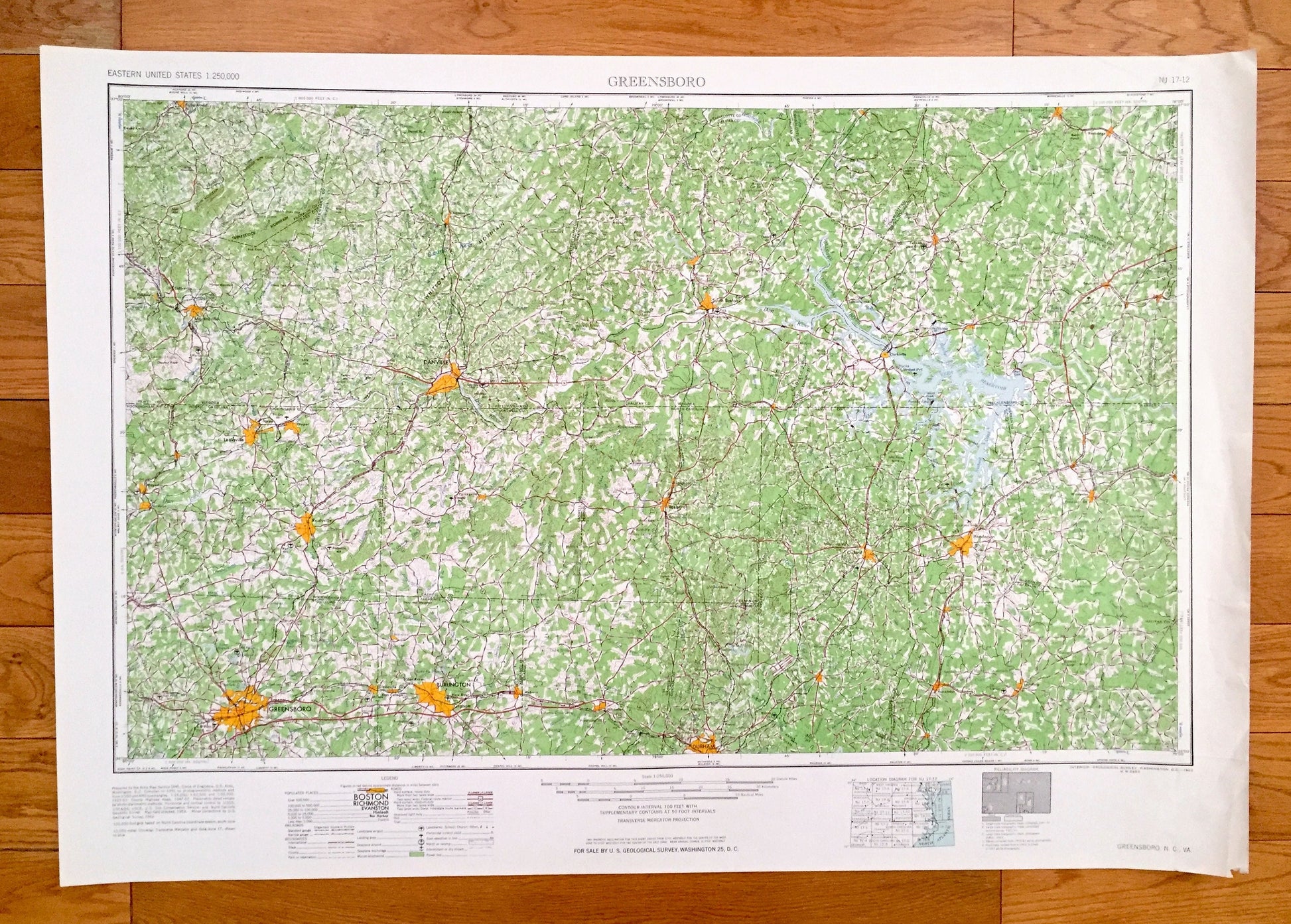 Antique Greensboro, North Carolina 1962 US Geological Survey Topographic Map – Virginia, Burlington, Durham, Reidsville Leaksville Graham NC