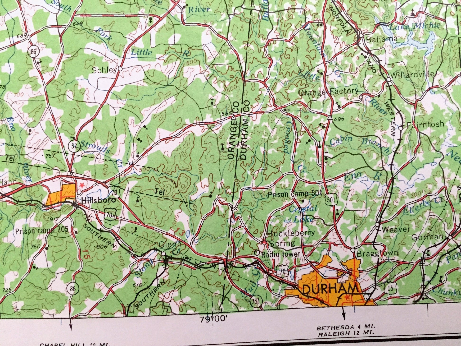 Points of Interest: NORTH CAROLINA - Dan River, Haw River, Tar River, Crystal Lake, Lake Michie, Flat Creek, Little Island Creek, Nutbush Creek and lots more hills, mountains, lakes, rivers, creeks, roads, highways, railroads.