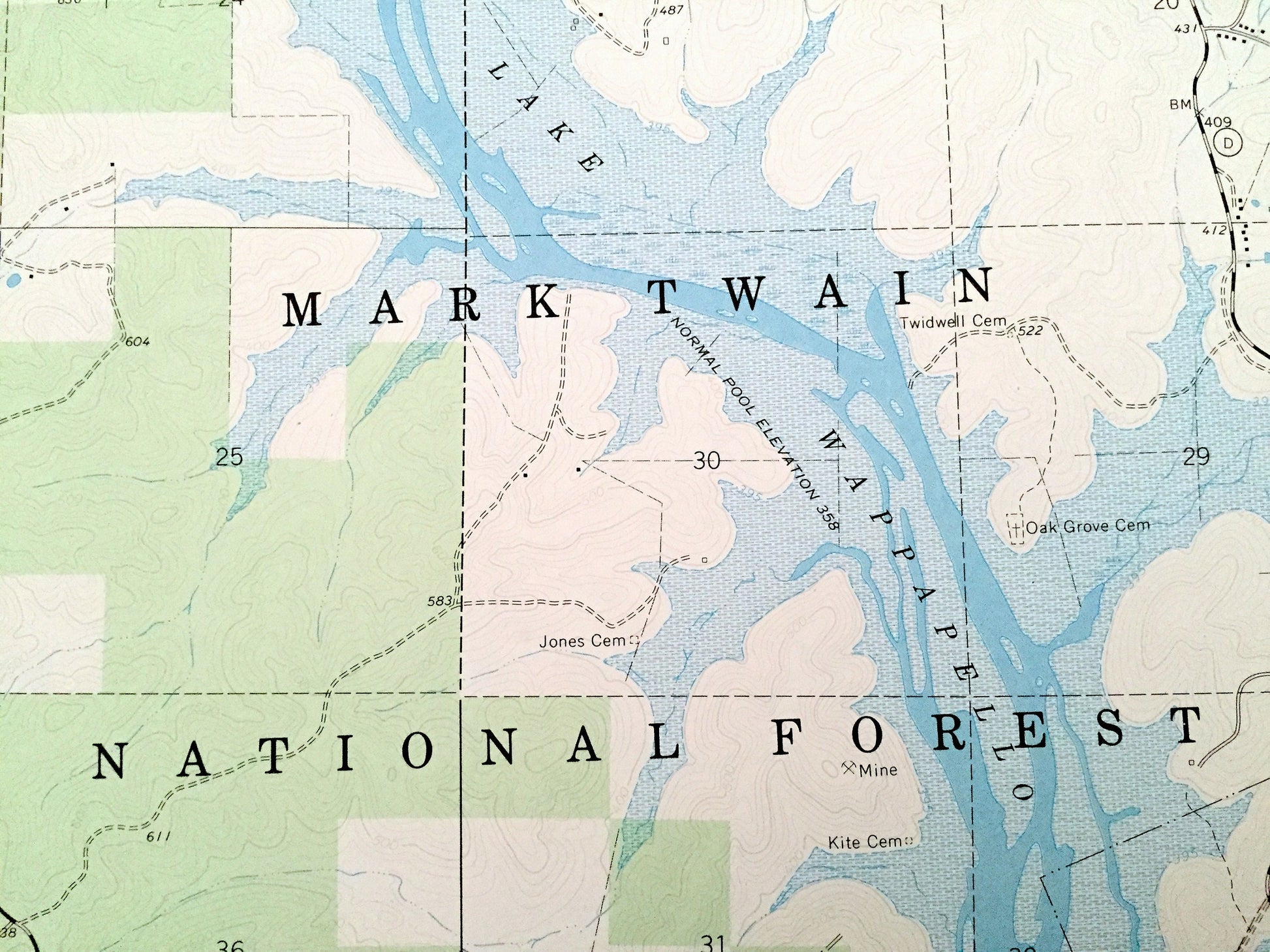 Points of Interest: Mark Twain National Forest, Camp Allen, Lone Hill, Browns Hollow, Pleasant Valley, Smoot Hollow, Halls Bluff, Happy Hollow, Lake Wappapello, St Francis River, Big Lake Creek, Caldwell Creek, Otter Creek, Davidsons Blue Spring, West Fork Lost Creek, Holliday Creek, and many more hills, streams, ponds, houses, schools, railroads, churches and roads.