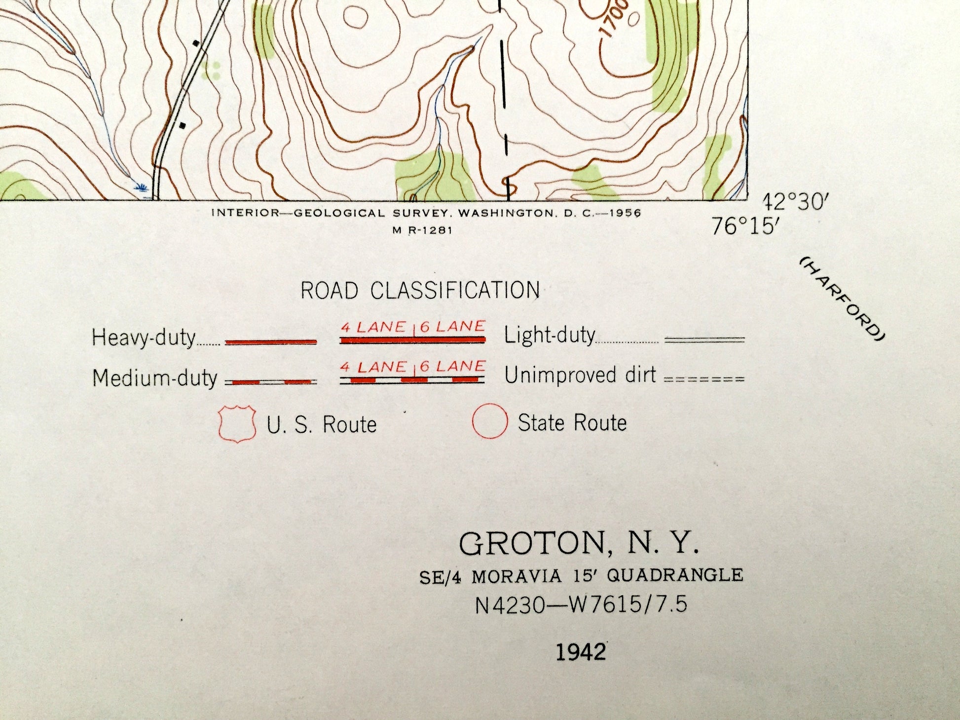 Beautiful, antique map of Groton, New York and surrounding Tompkins, Cortland, and Cayuga County area. This is an authentic 1942 edition, 1956 print from the U.S. Geological Survey and NOT a computer reproduction.