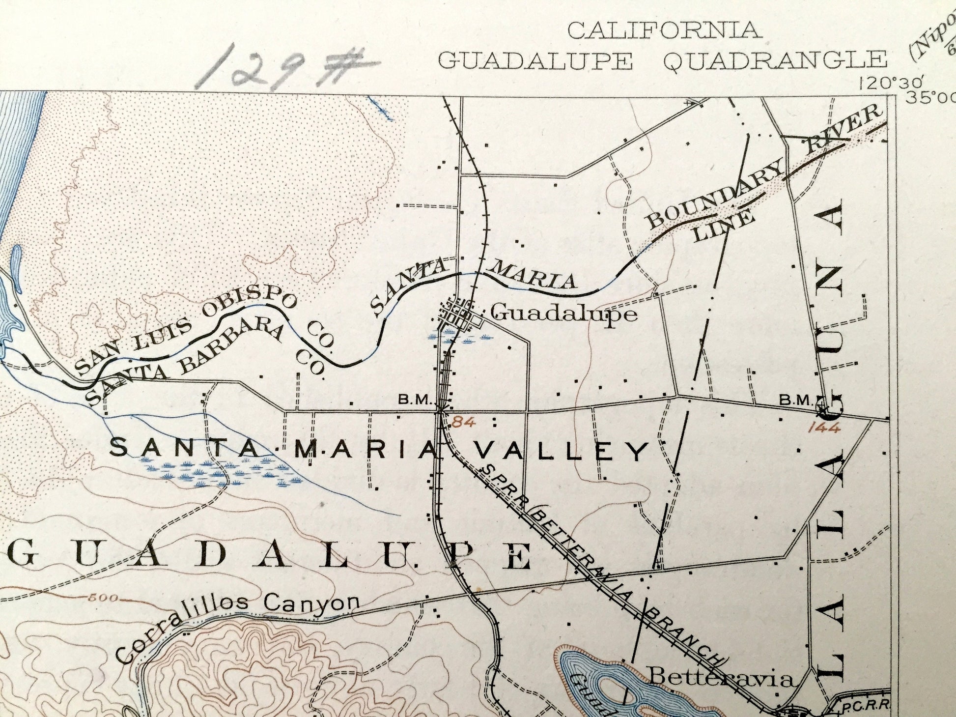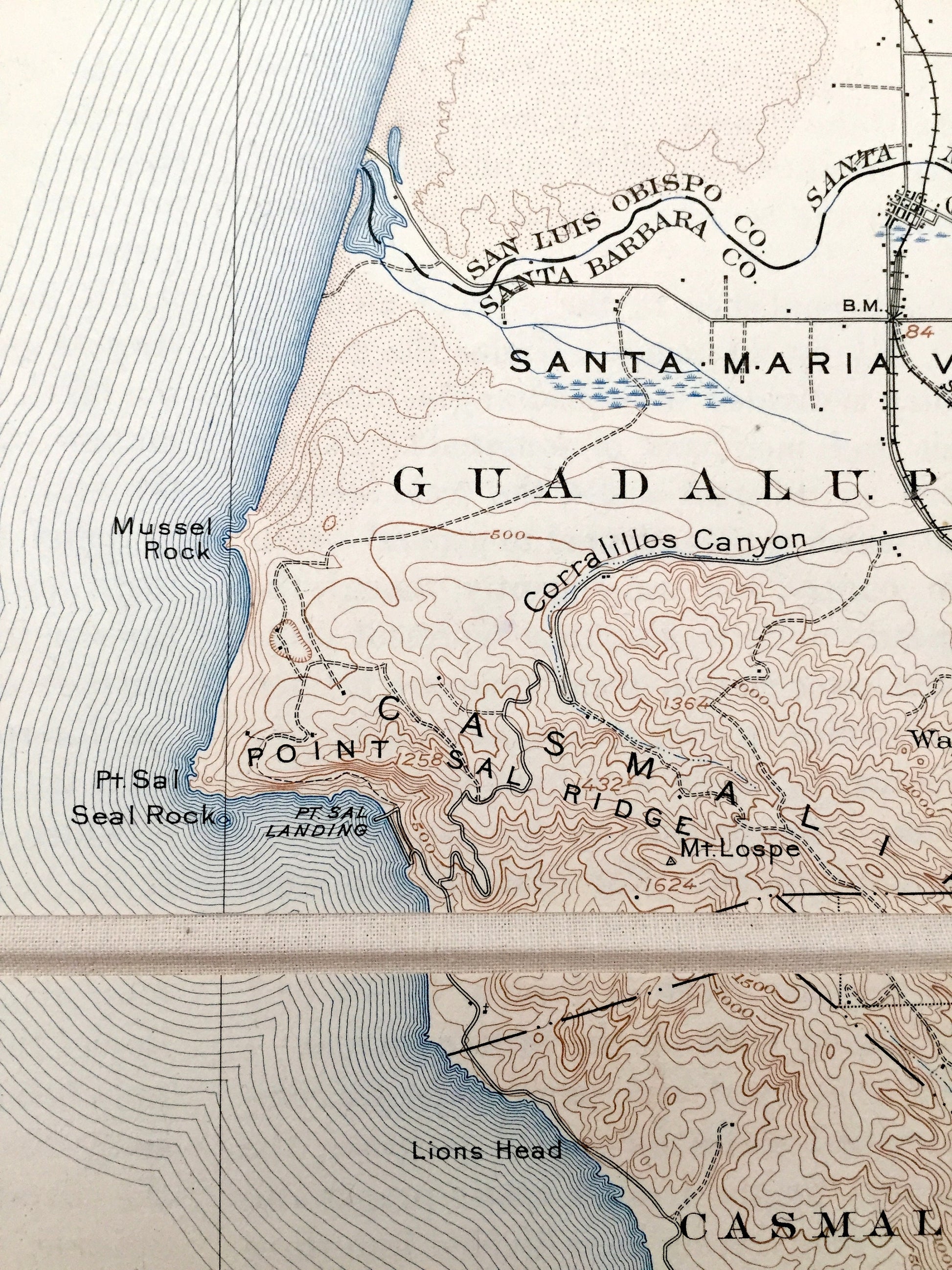 Beautiful, antique map of Guadalupe, California and surrounding Santa Barbara County and San Luis Obispo County coastal area. This is an authentic 1905 edition, 1937 print from the U.S. Geological Survey and NOT a computer reproduction.