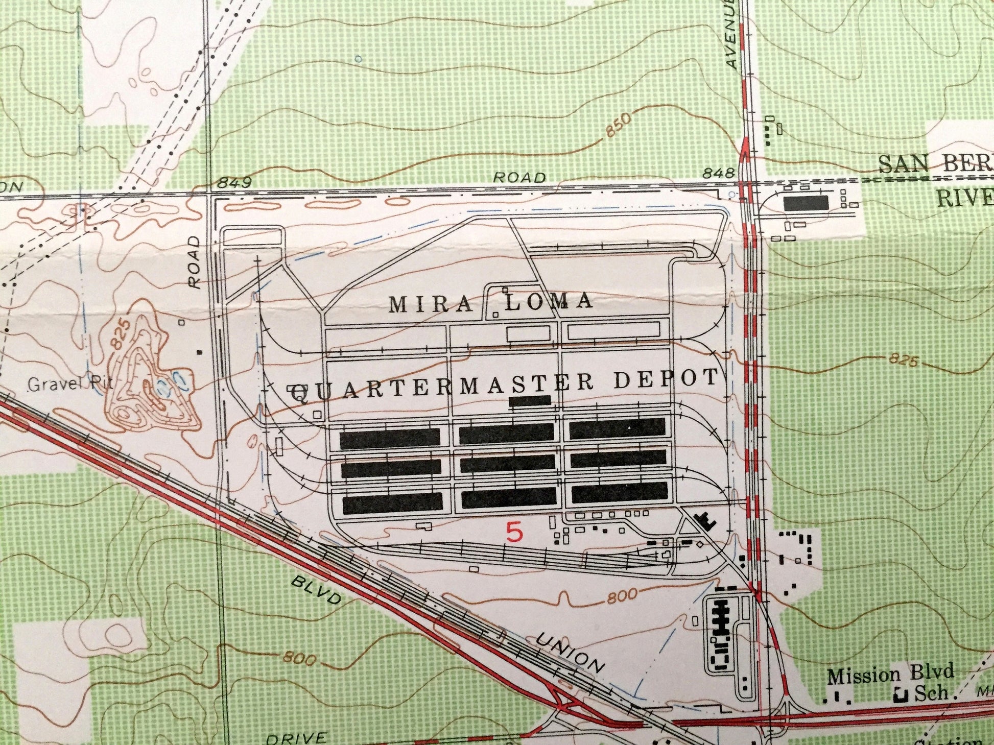 Points of Interest: Red Hill, East Etiwanda Creek, Atchison Topeka and Santa Fe Railway, Cucamonga Creek, Southern Pacific Railroad, Kaiser Steel Plant, Ontario International Airport, Union Pacific Railroad, Jurupa Mountains, Mira Loma Quartermaster Depot, and many more hills, streams, ponds, houses, schools, churches and roads.